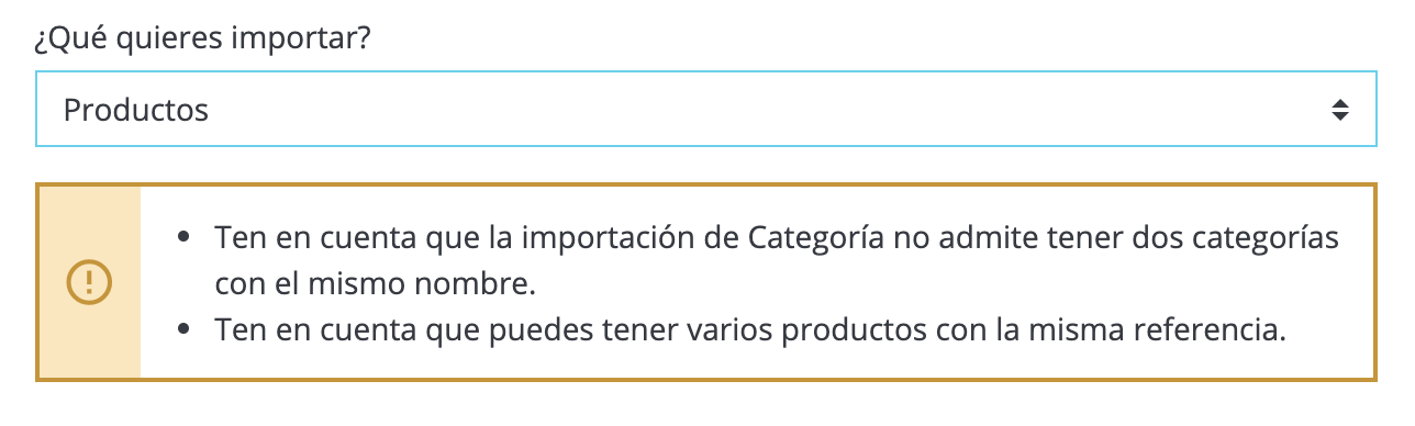 En primer lugar observaremos un cuadro de texto en el que aparece la pregunta ¿Qué deseas importar? Seleccionamos en el desplegable la opción PRODUCTOS.