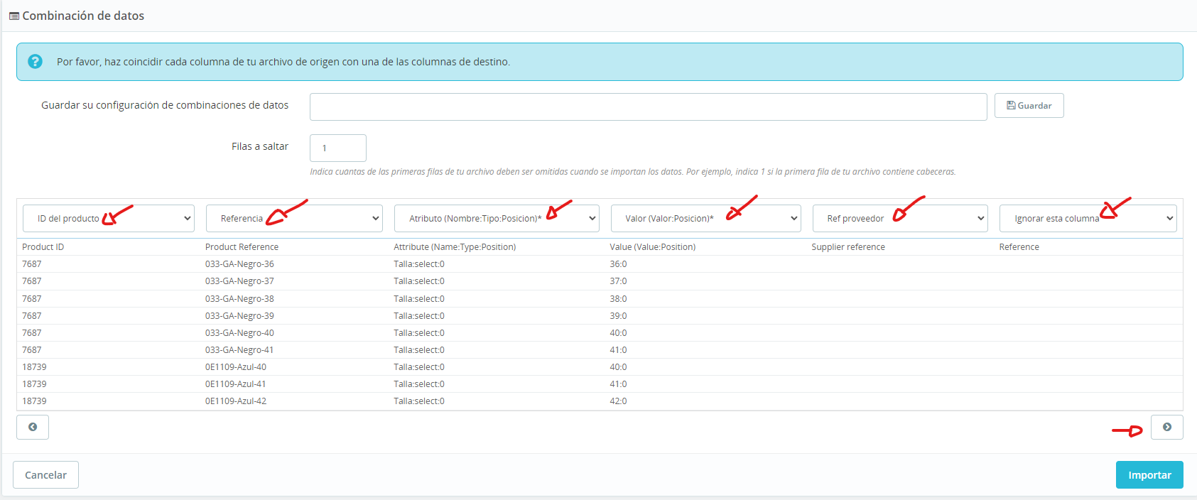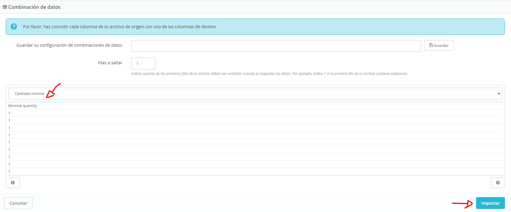 Seguidamente observaremos un cuadro de texto en el que aparece la pregunta ¿Qué deseas importar? Seleccionamos en el desplegable la opción COMBINACIONES.