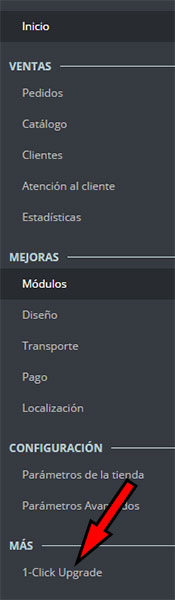 ¡Listo! Con ello y, en apenas un par de pasos, habremos conseguido instalar el módulo e incluso se creará un acceso a 1-Click Upgrade en el menú principal (en la sección de “Más”) para tenerlo más accesible, tal y como se puede comprobar en esta captura de pantalla (si no aparece el acceso podemos pulsar F5):