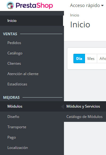 En primer lugar debes tener una tienda activa en la plataforma Prestashop y acceder al panel de gestión o INICIO.