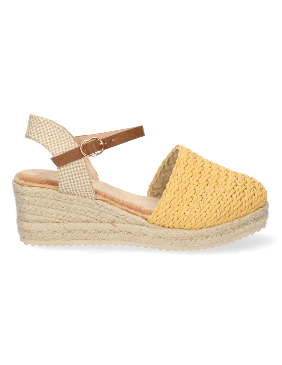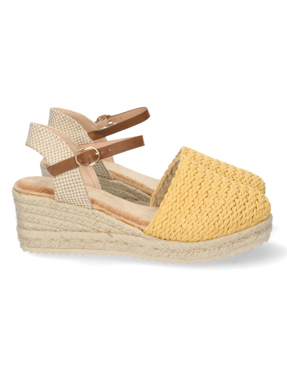 Sandalia de Cuña para Mujer, Forrada de Yute, con Pala Cerrada de Rafia, y Cierre de Hebilla, Primavera Verano 2022