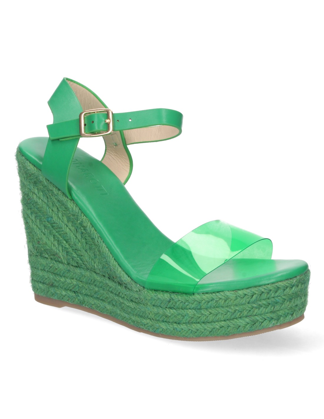 Sandalia de Cuña para Mujer, Forrada de Yute Pintado, Pala de Vinilo Transparente, y Cierre de Hebilla, Primavera Verano 2022