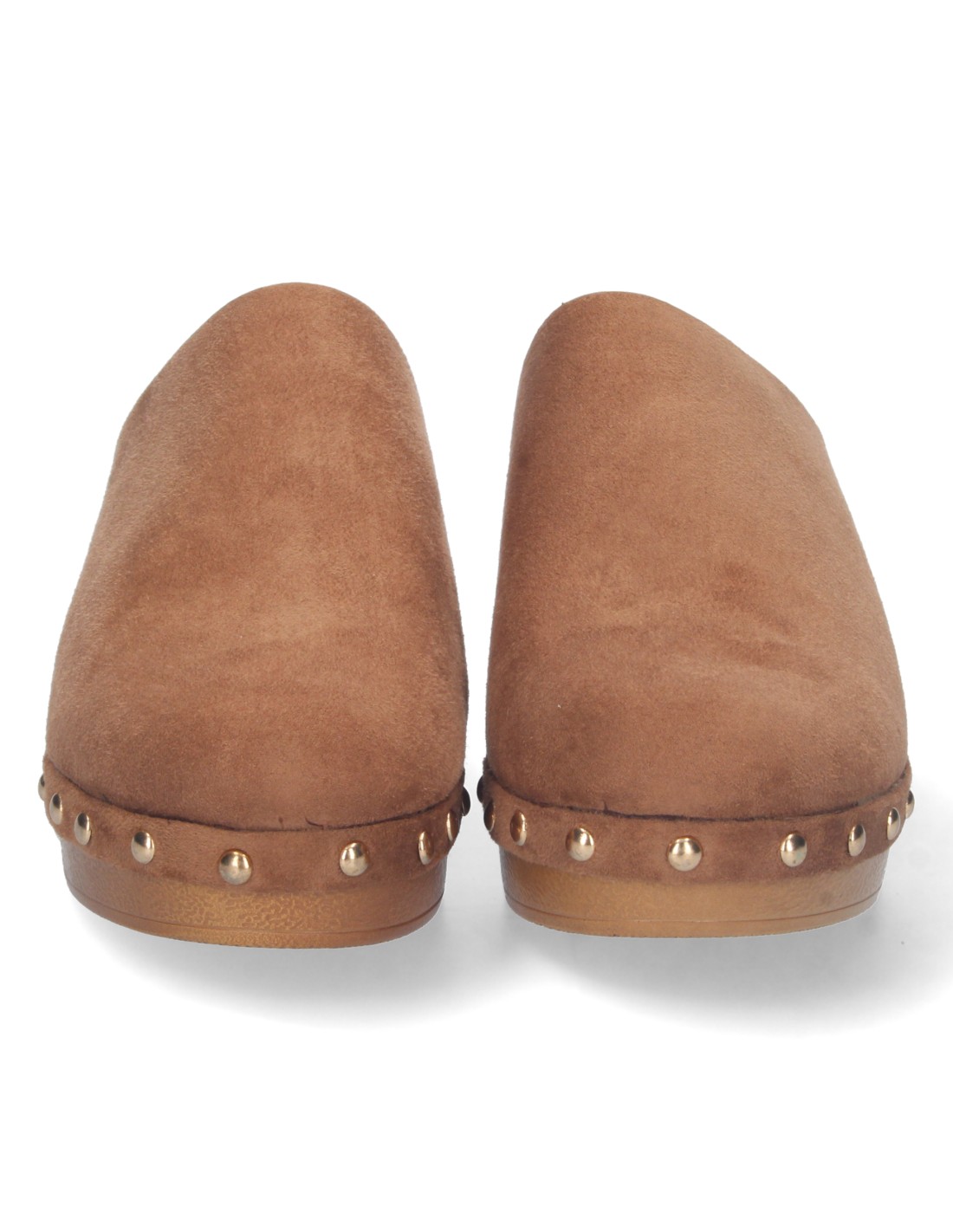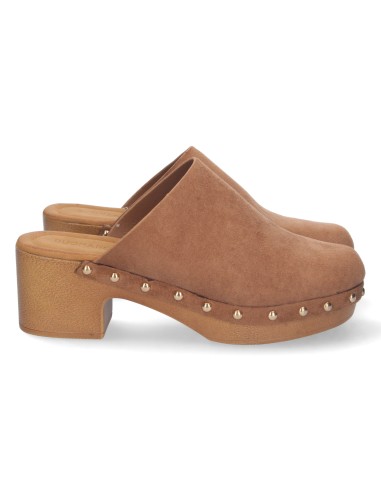 Sandalia de Tacón para Mujer, Comoda, Material de Imitacion a Madera, con Pala Cerrada, Remaches, y Talon Abierto