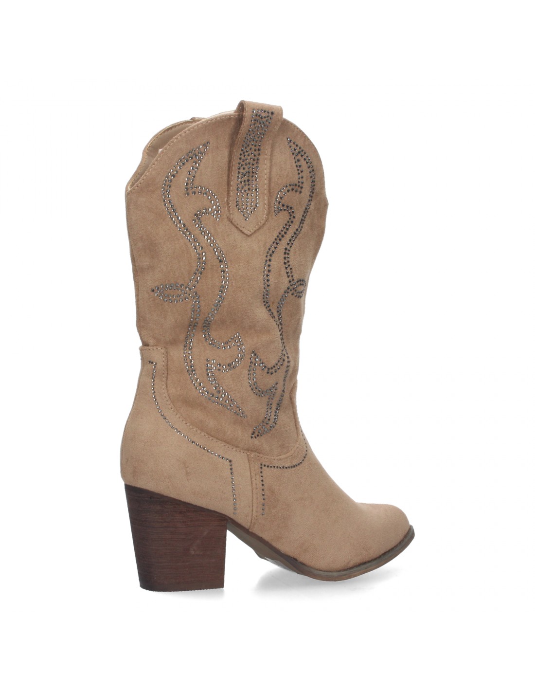 Bota campera con diseño de piedras brillantes en la caña y punta redonda, estilo vaquero y cierre de cremallera. Cómodas otoño e invierno.