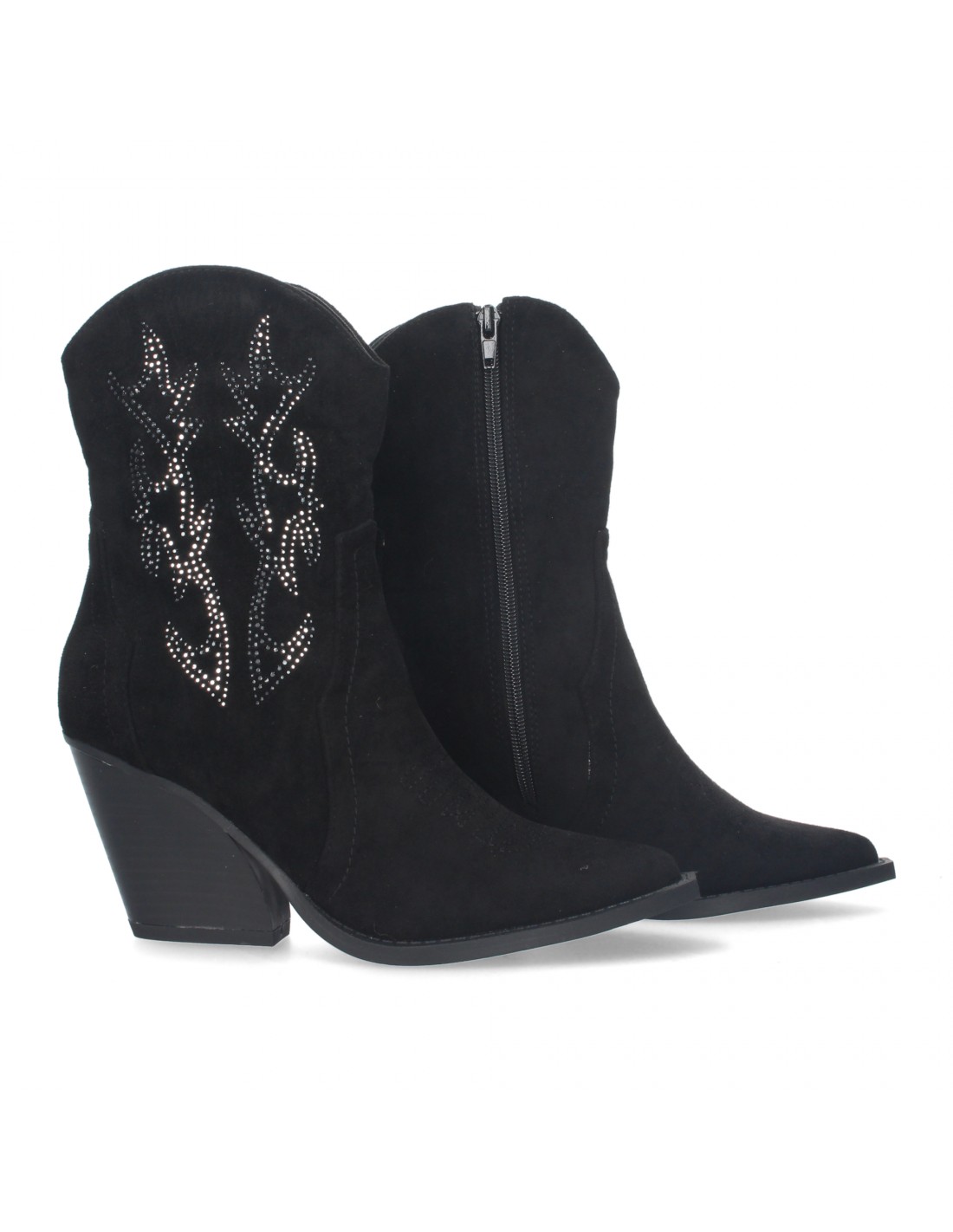 Botin campero con diseño de piedras brillantes en la caña y bordado en el empeine, estilo vaquero modernizado y cierre de cremallera. La caña mide 17'5cm.
