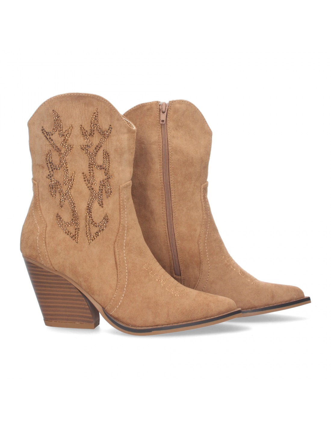 Botin campero con diseño de piedras brillantes en la caña y bordado en el empeine, estilo vaquero modernizado y cierre de cremallera. La caña mide 17'5cm.
