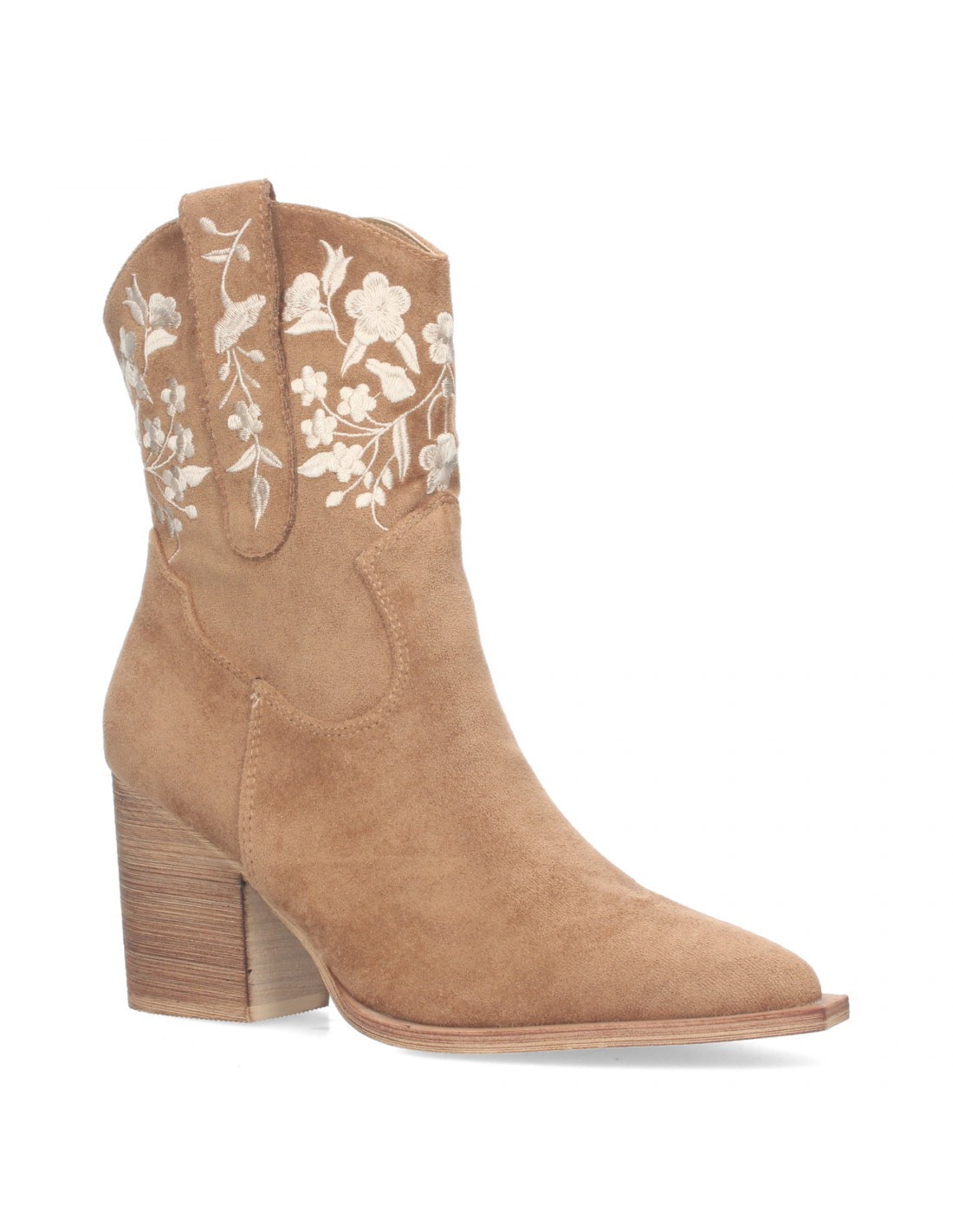 Botín campero de tacón medio con diseño de flores en la caña y cierre de cremallera.