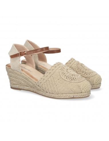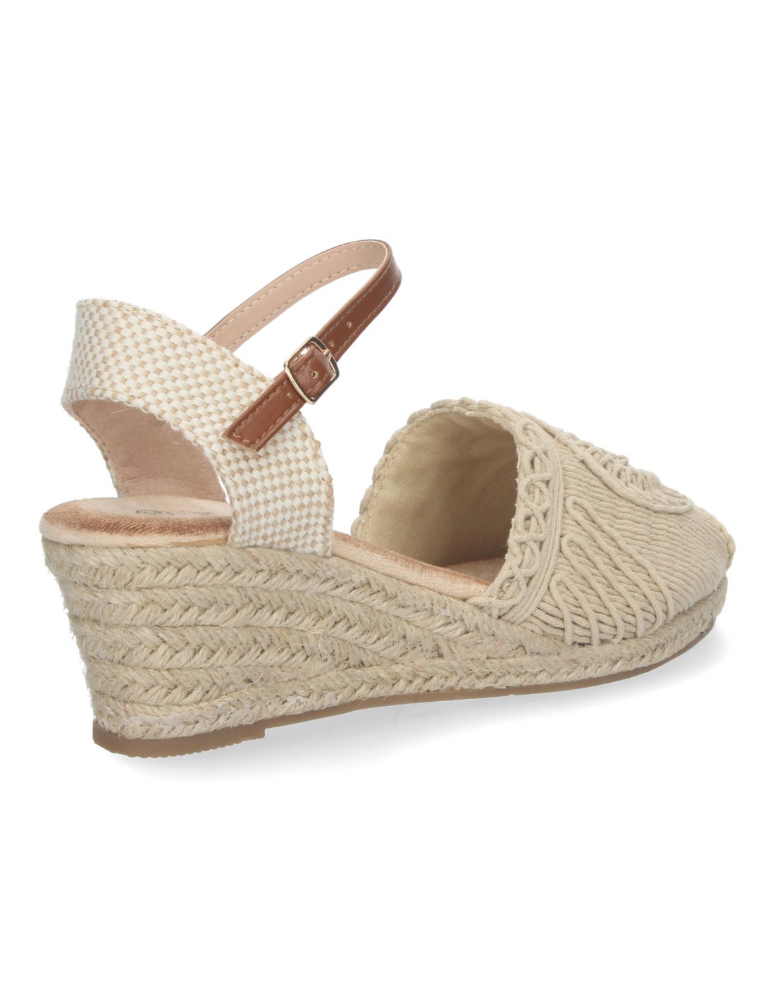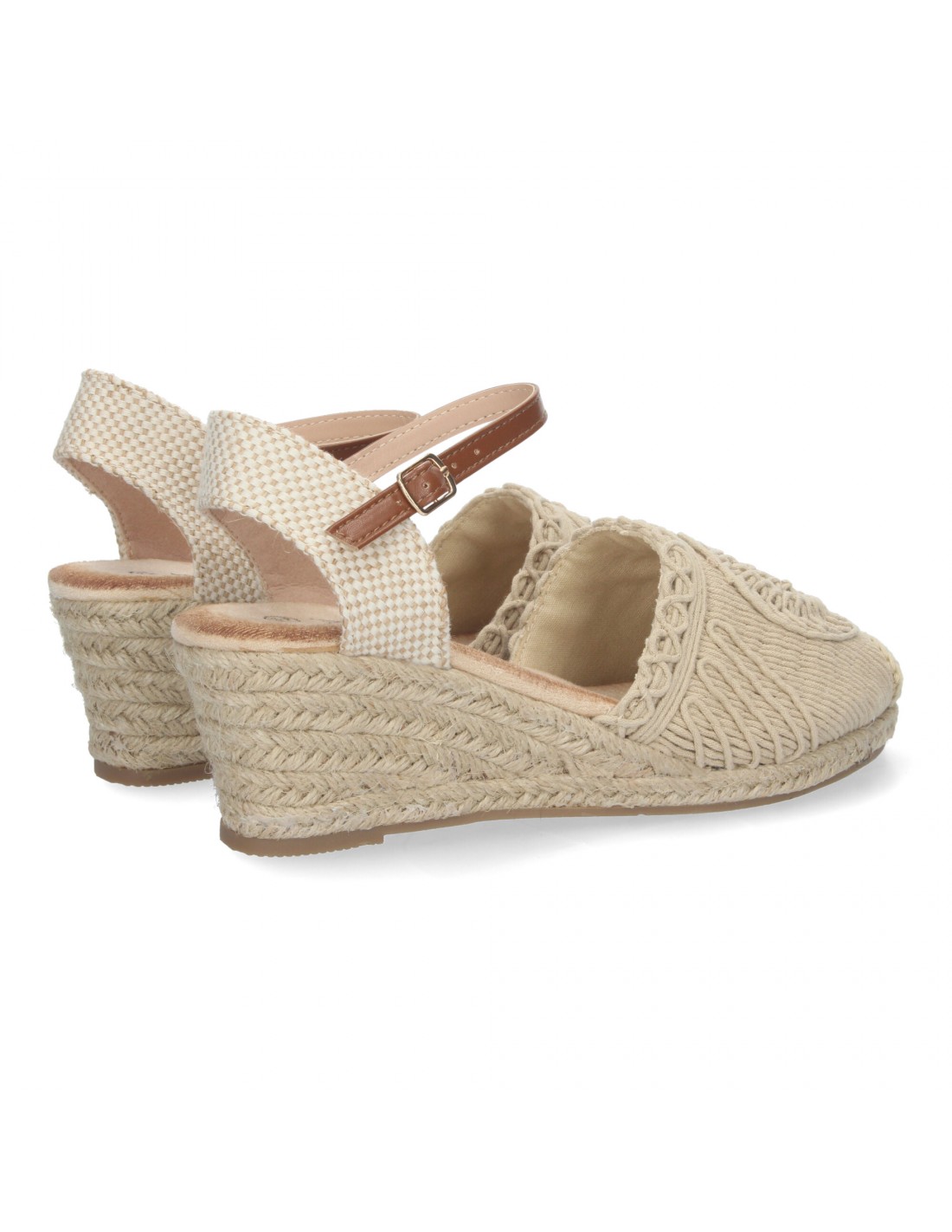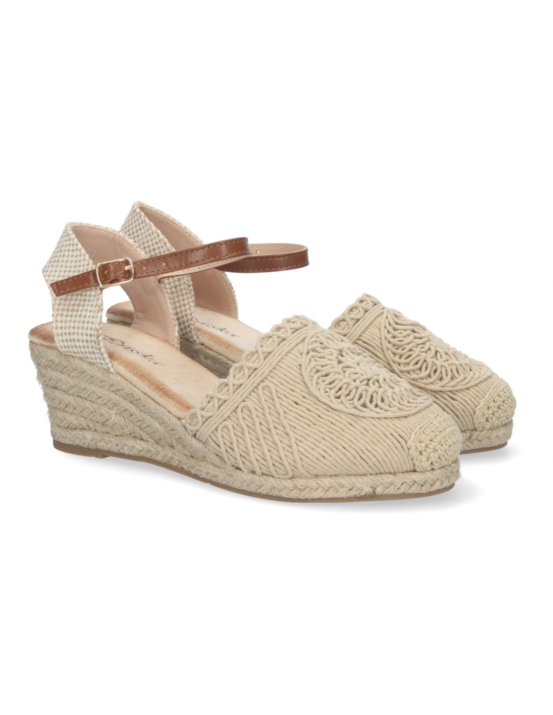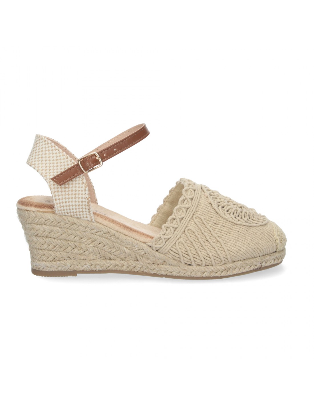 Sandalia de Cuña para Mujer, Estilo Valenciana, Forrada de Yute, Pala Bordada, y Cierre de Hebilla.