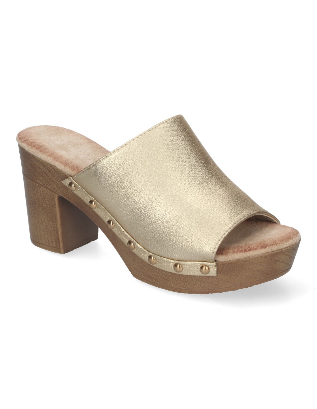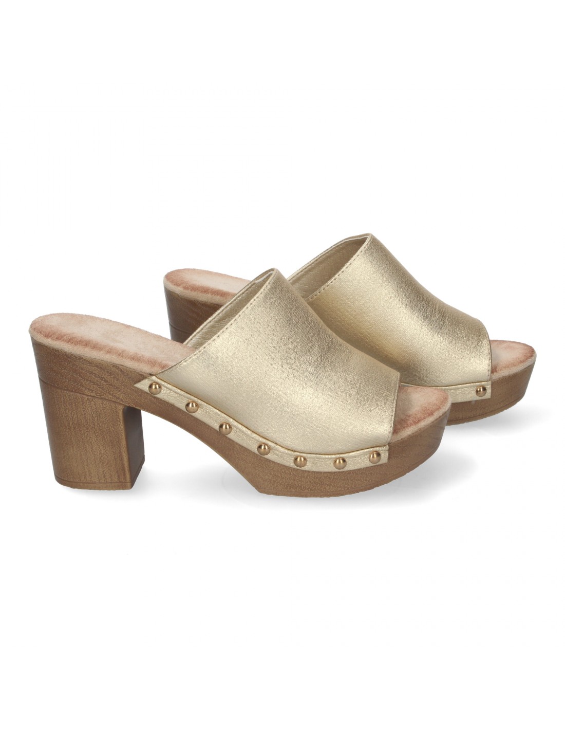 Zueco de Tacon Alto para Mujer, Comodo, Material de Imitacion a Madera, Pala Lisa con Tachuelas, y Talon Abierto.