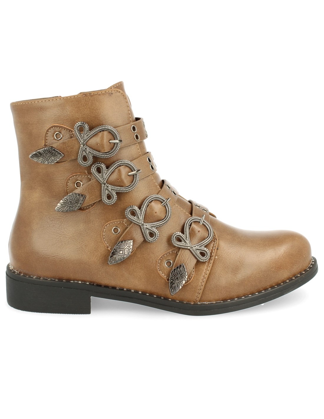Botín plano de punta redonda con cierre de cremallera en el interior y correas con hebillas ornamentadas a lo largo del empeine como detalle.