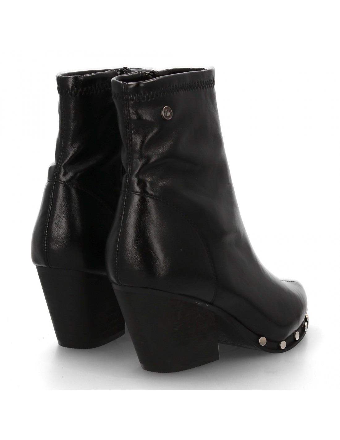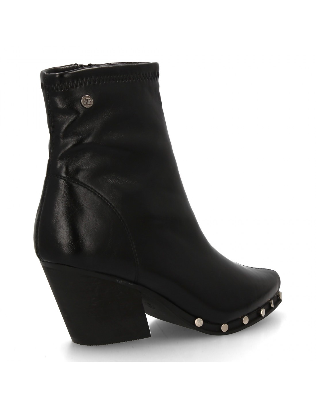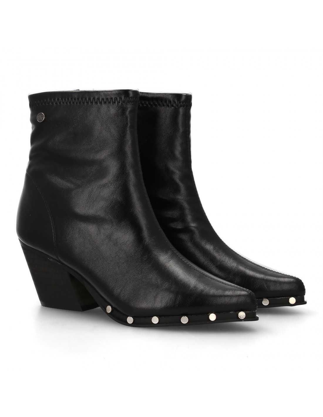 Botín de mujer con tacón cubano, detalles de tachuelas, estilo moderno acabado en pico, estampado liso, cierre lateral de cremallera, ideal Otoño Invierno.
