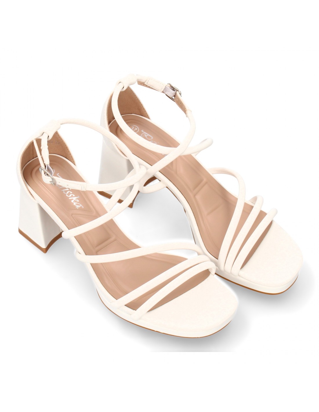 Sandalia de tacón con diseño de tiras finas y talón cerrado. Su plataforma y tacón ancho proporcionan comodidad, ideal para ocasiones especiales. Cierre de hebilla.