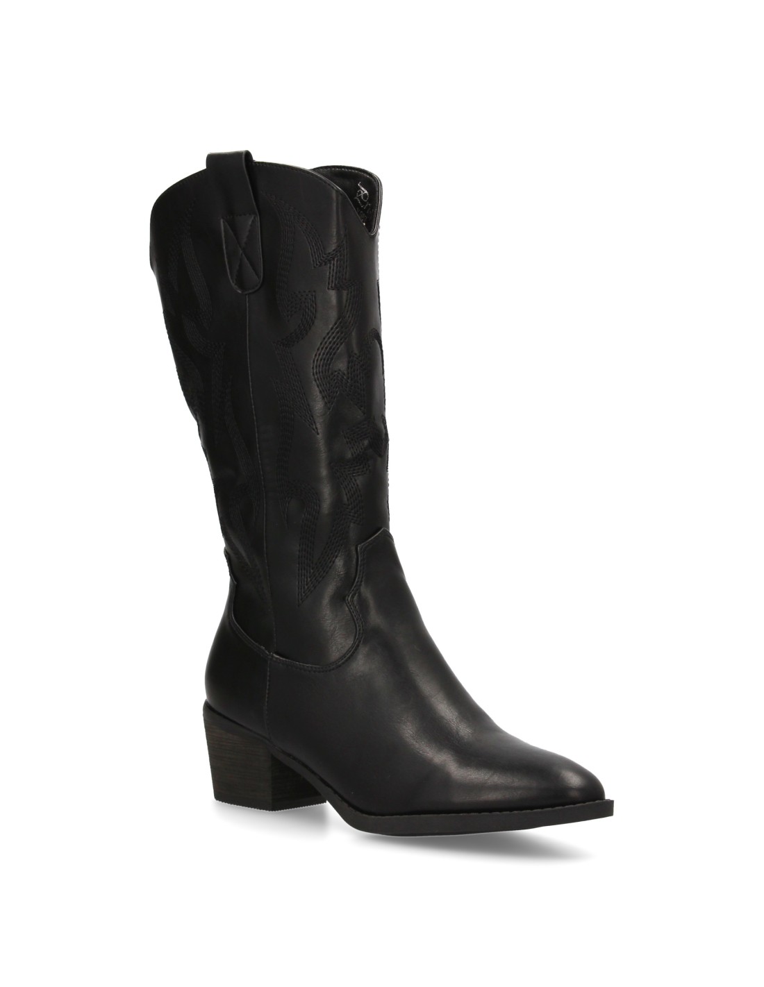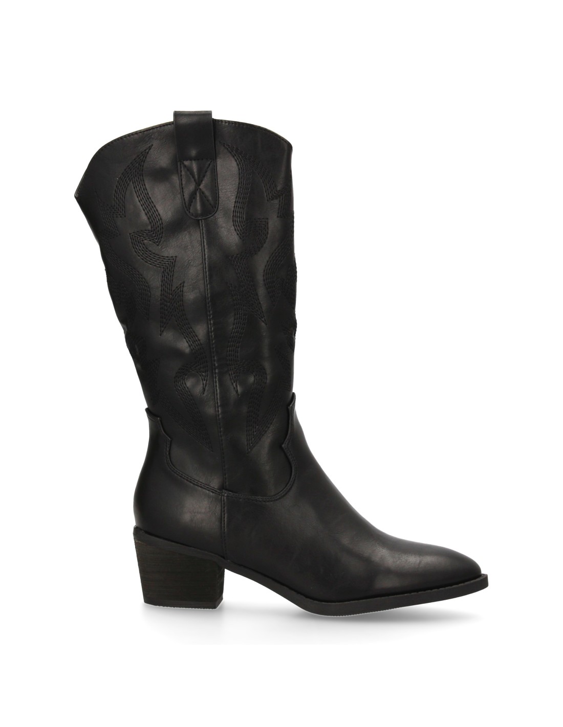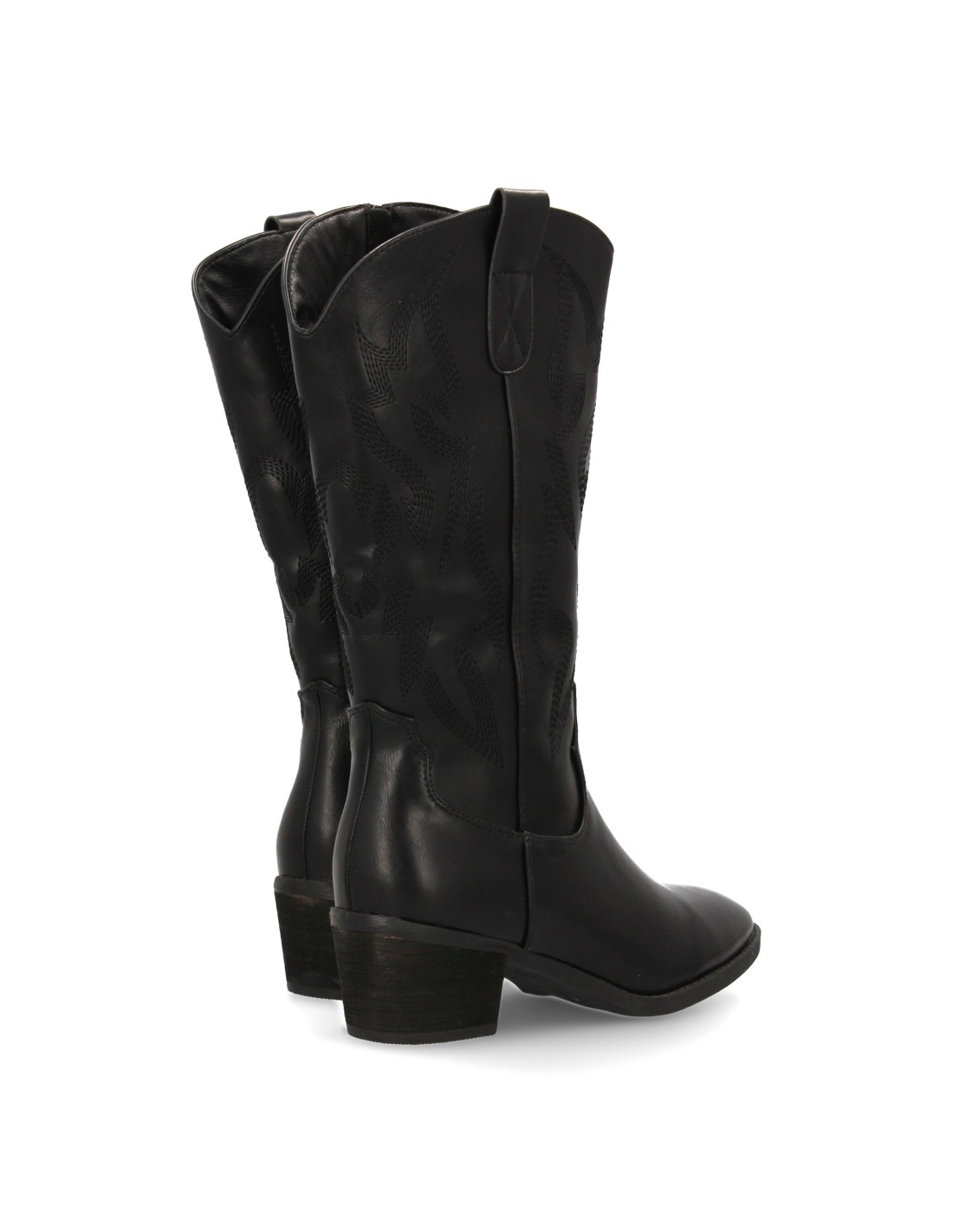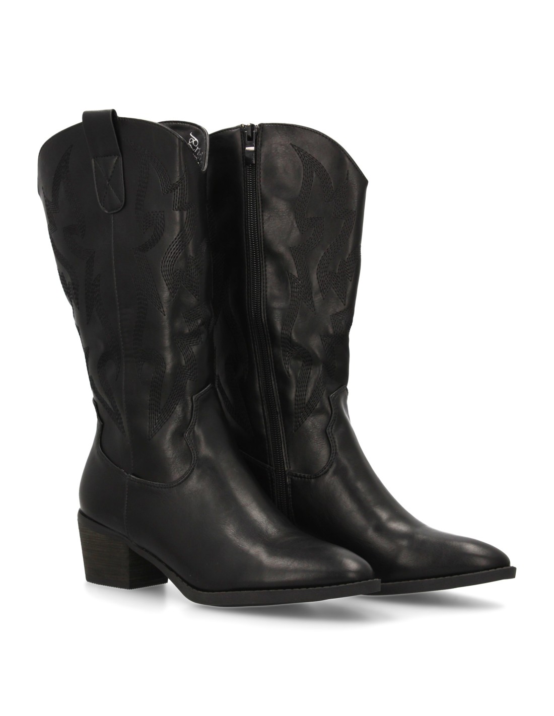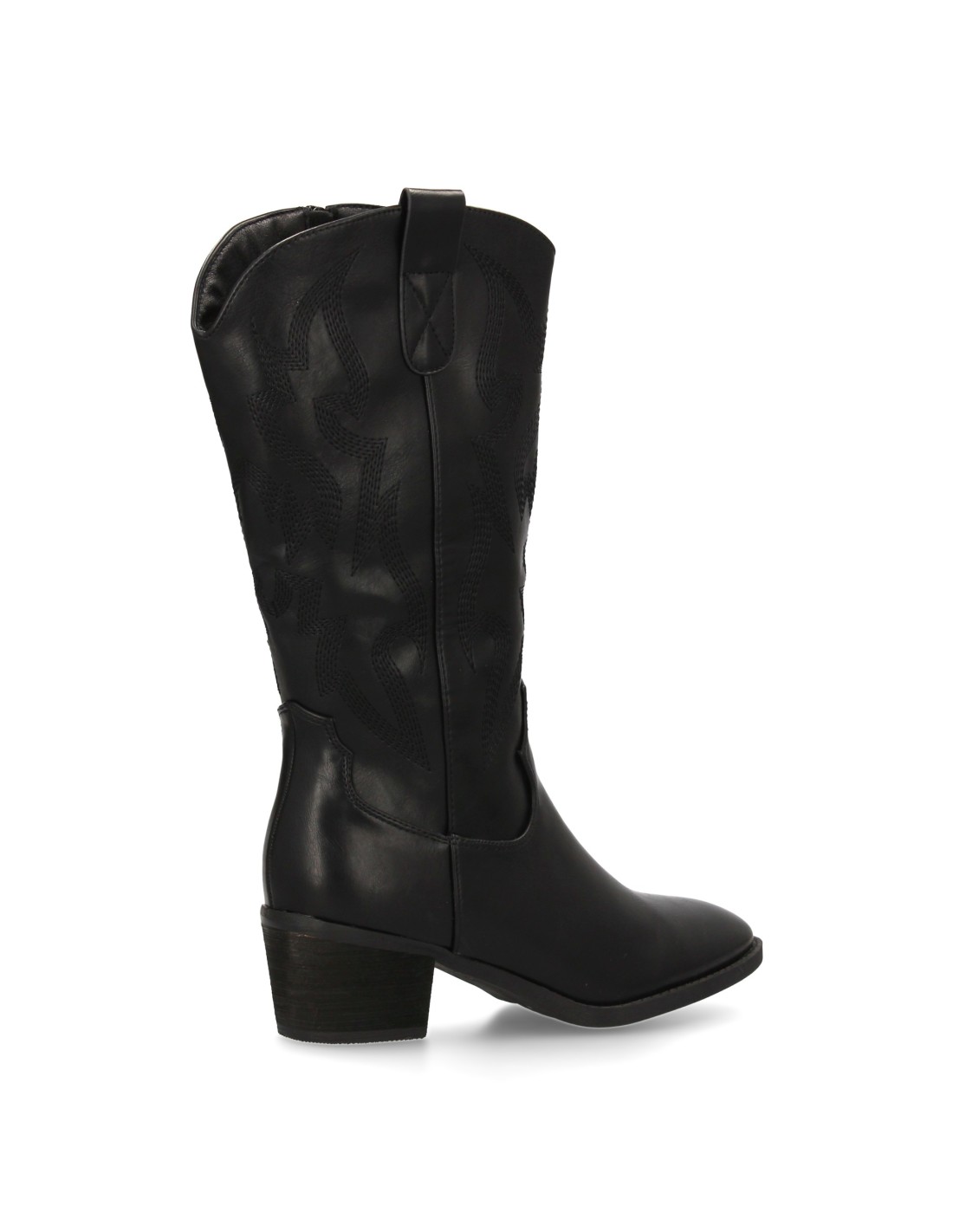 Bota cowboy con bordados decorativos en la caña y tacón ancho comodo. Diseño moderno con punta fina y cierre de cremallera. Ideal para mujer Otoño invierno.