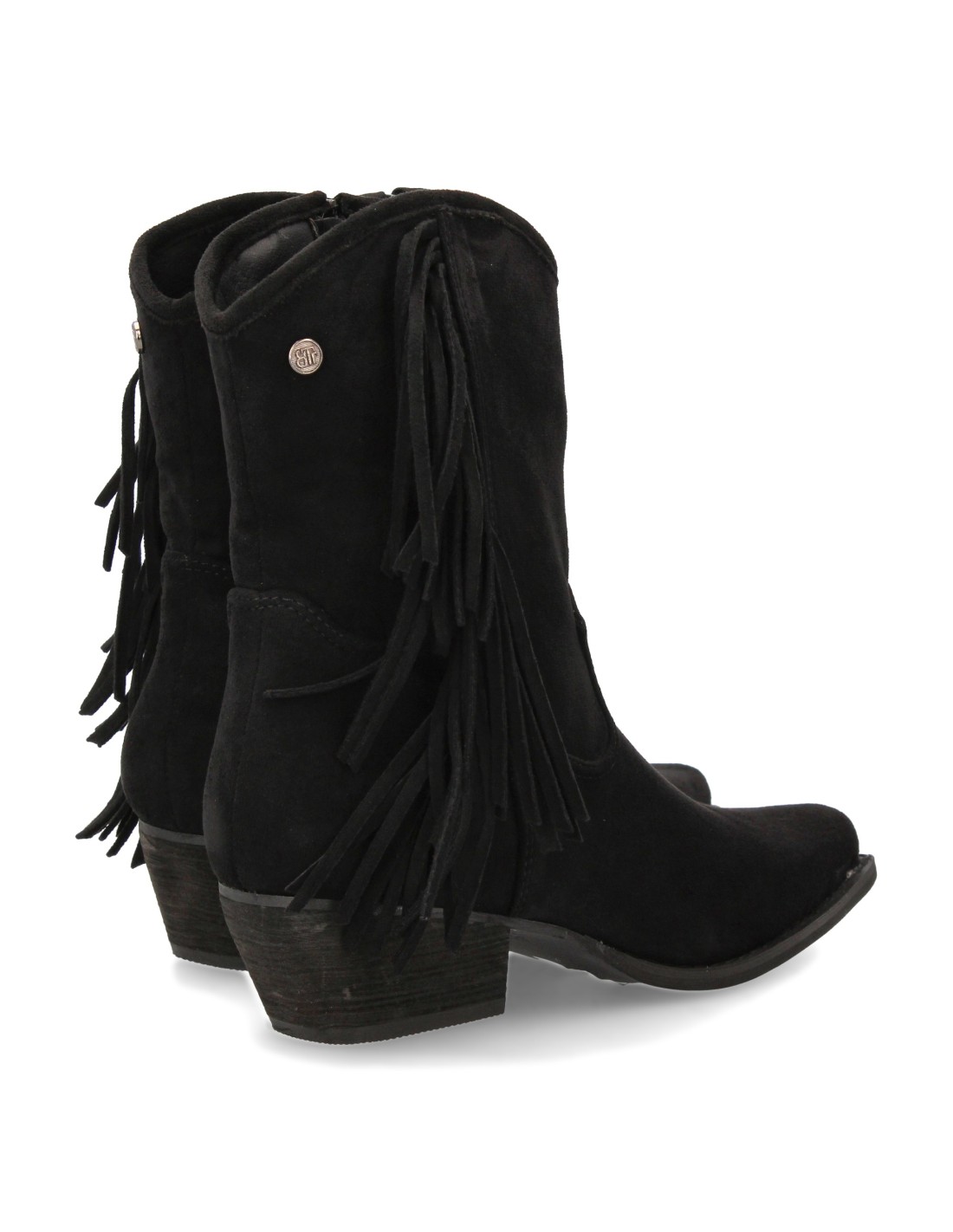 Bota campera con flecos laterales, punta fina y tacón bajo. Estampado liso para la temporada Otoño Invierno. Ideal para mujer.