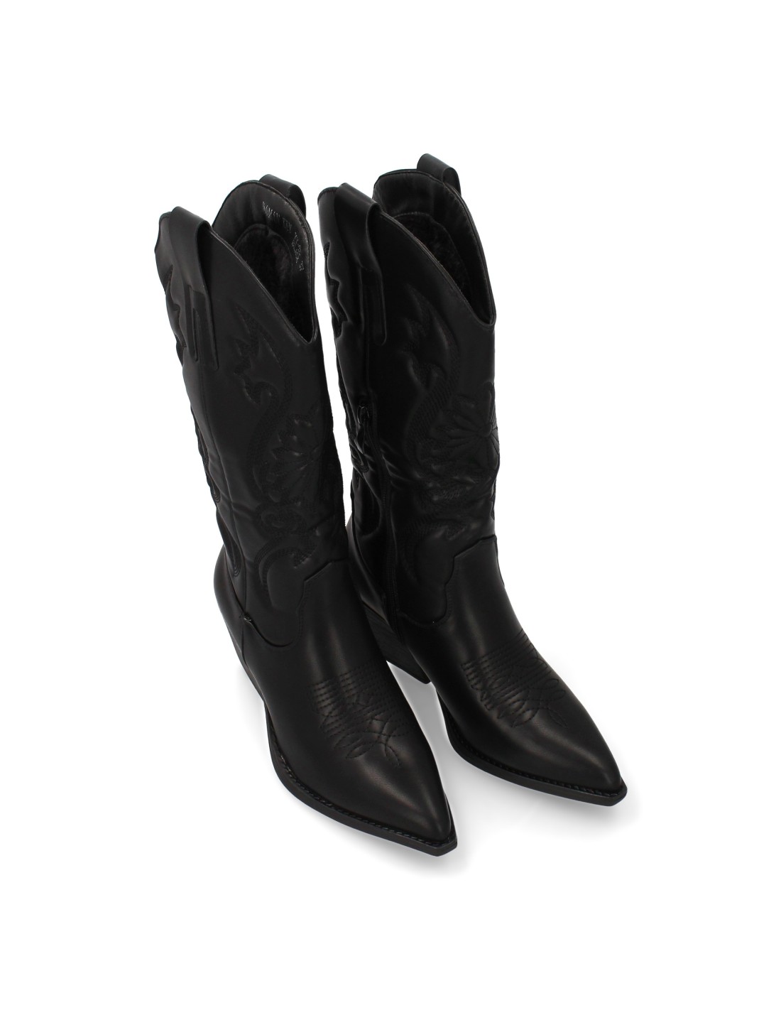 Bota cowboy de caña alta con bordados para mujer. Tacón medio y punta fina, estampado liso. Estilo campero y cierre de cremallera, ideales para temporada otoño invierno.