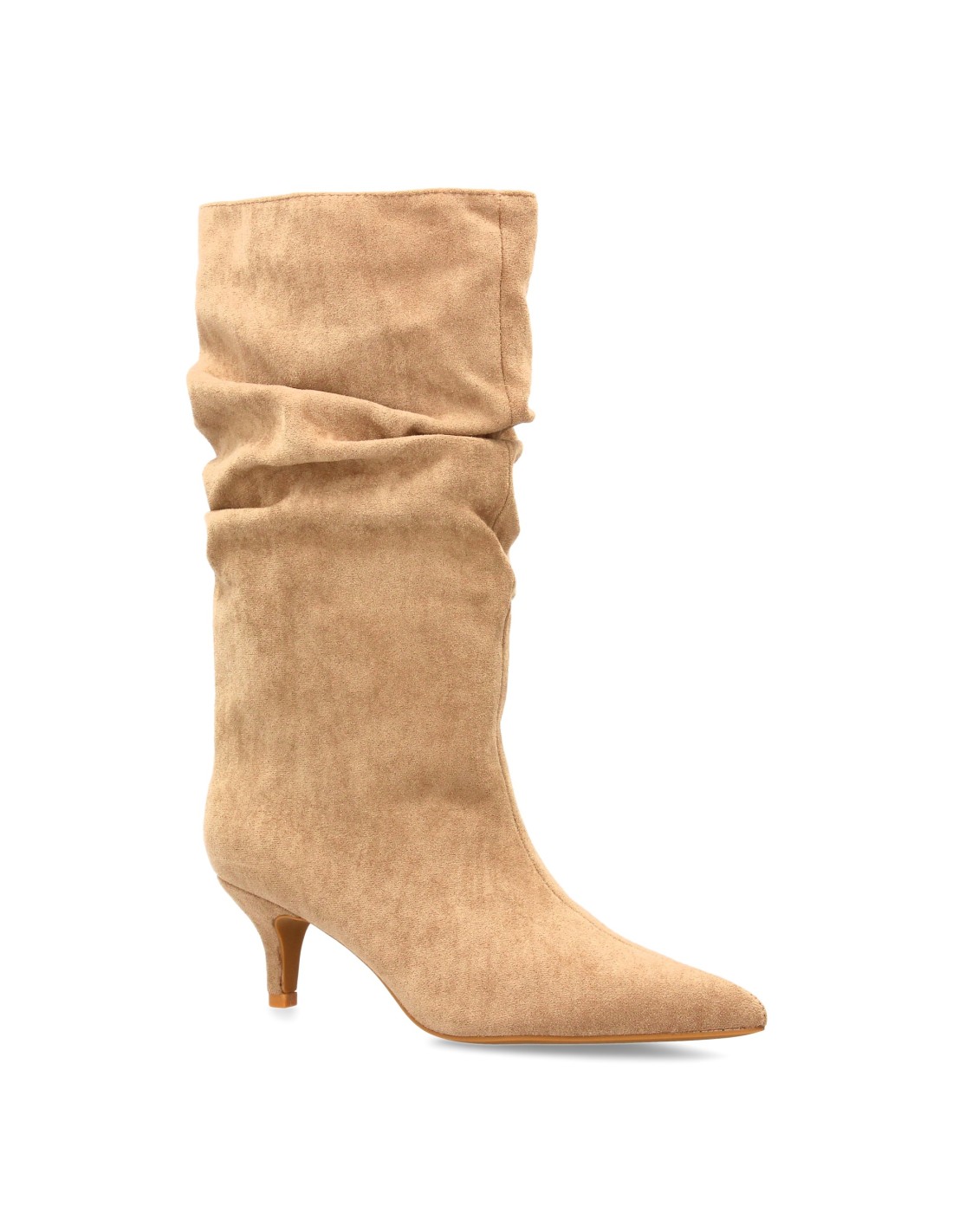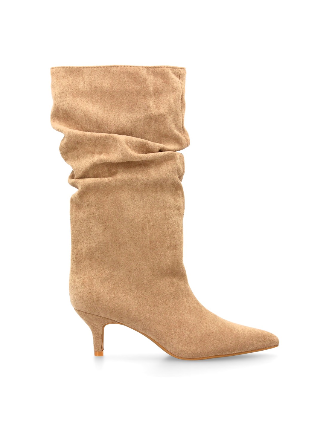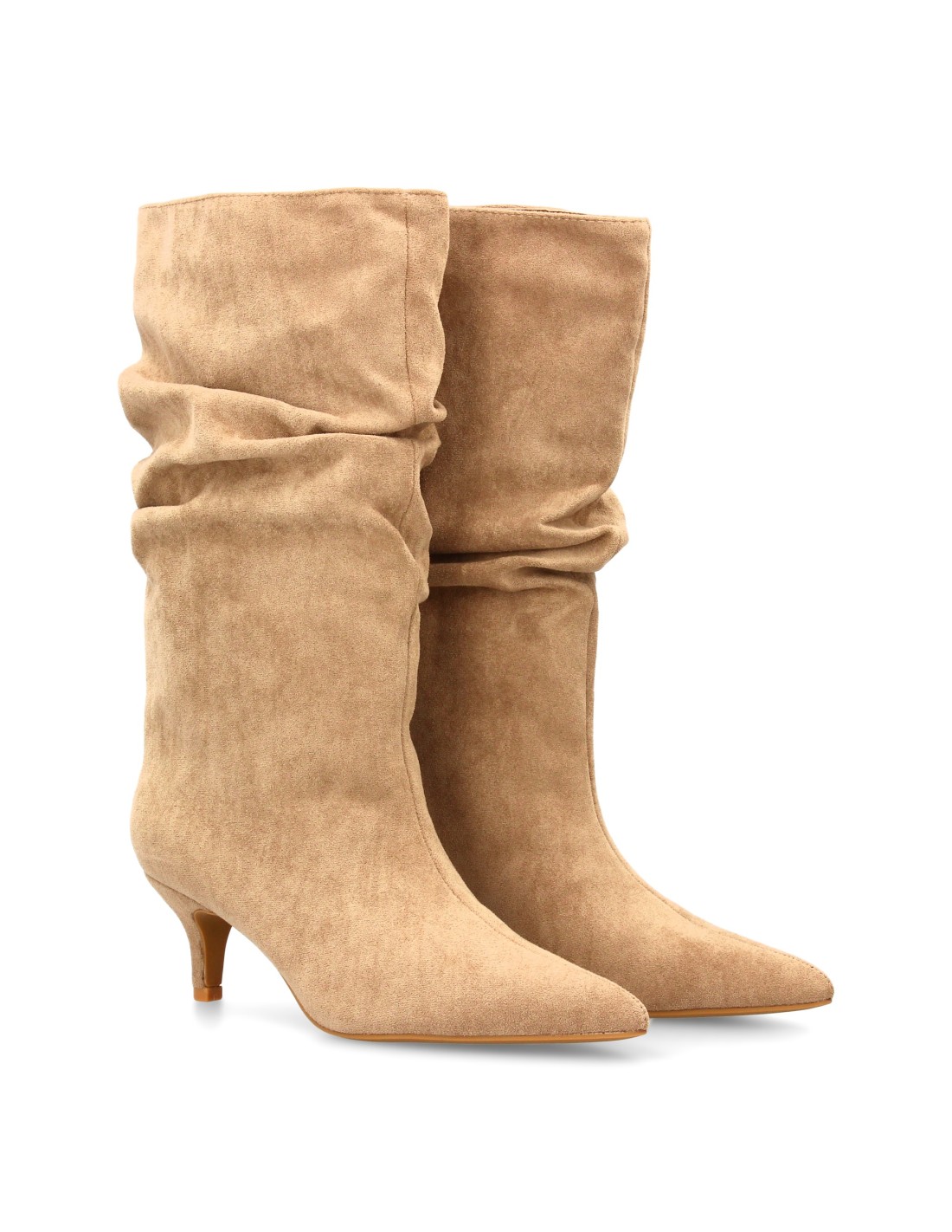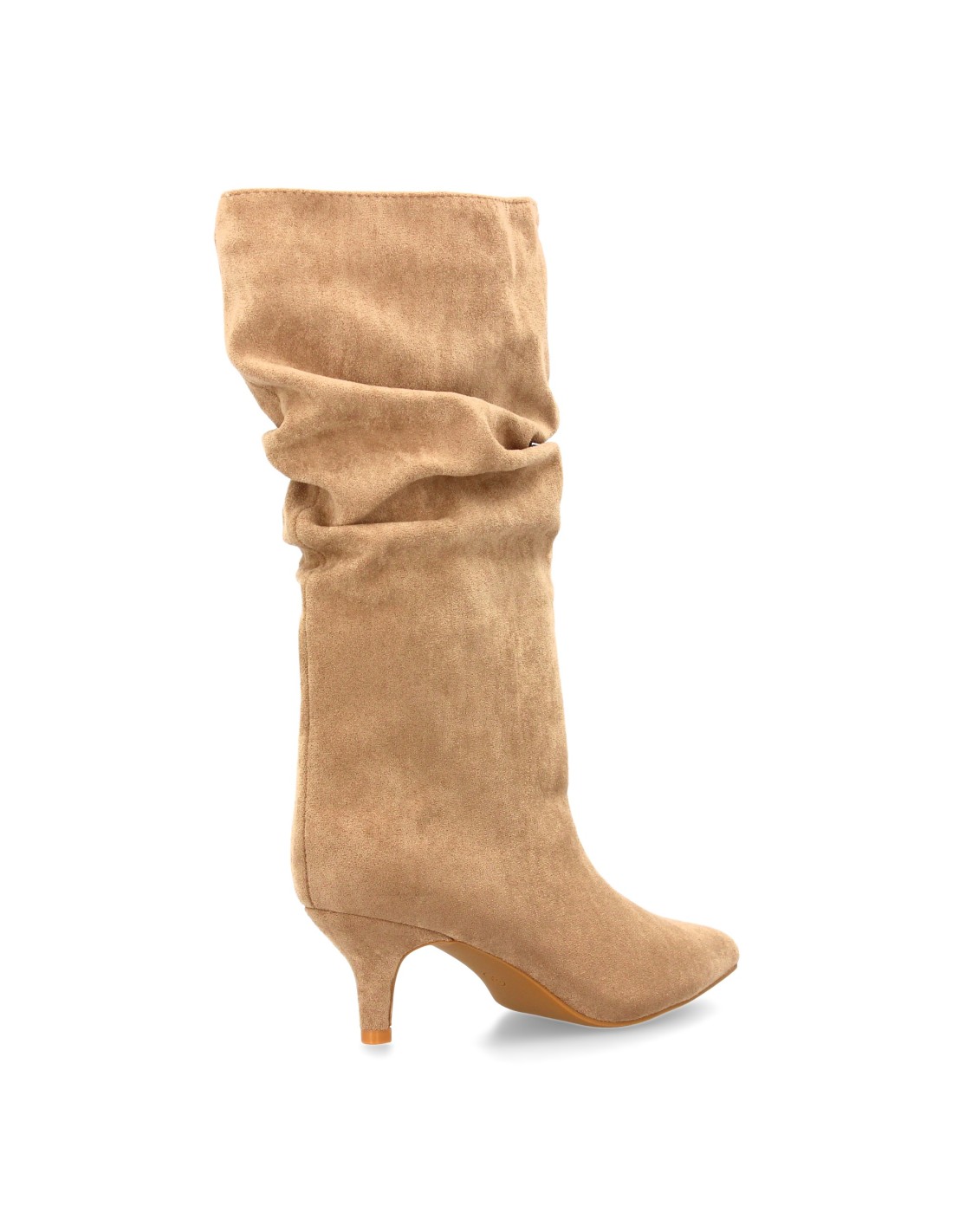 Bota de caña alta efecto arrugado, tacón fino. Cierre de cremallera estampado liso, ideal para mujer temporada otoño invierno.