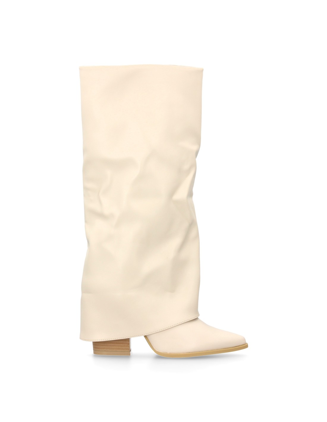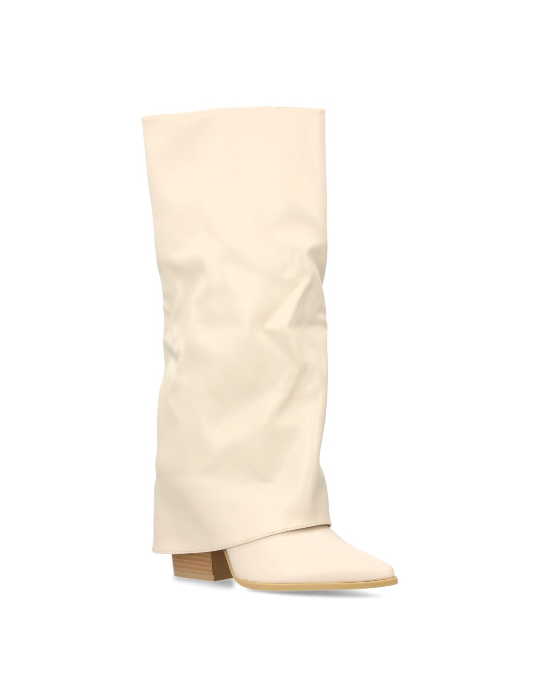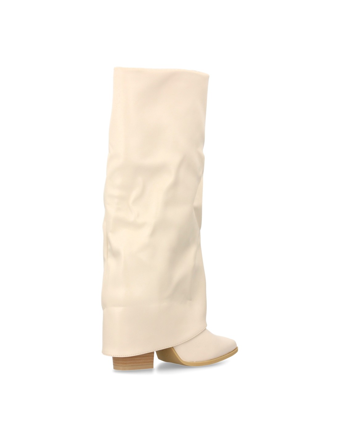 Bota alta de tacón para mujer con diseño moderno con acabado efecto arrugado, elegante con punta fina y tacón ancho bajo. Ideal para temporada Otoño invierno.
