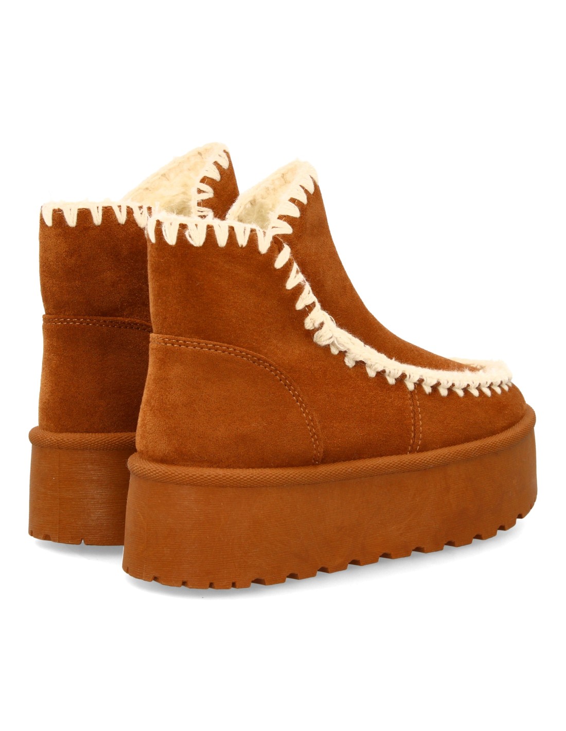 Botin de mujer australiano con plataforma, ideal dias frios temporada Otoño Invierno. Forrado borreguillo, costuras gruesas decorativas, diseño artesanal.