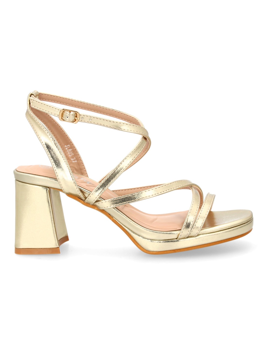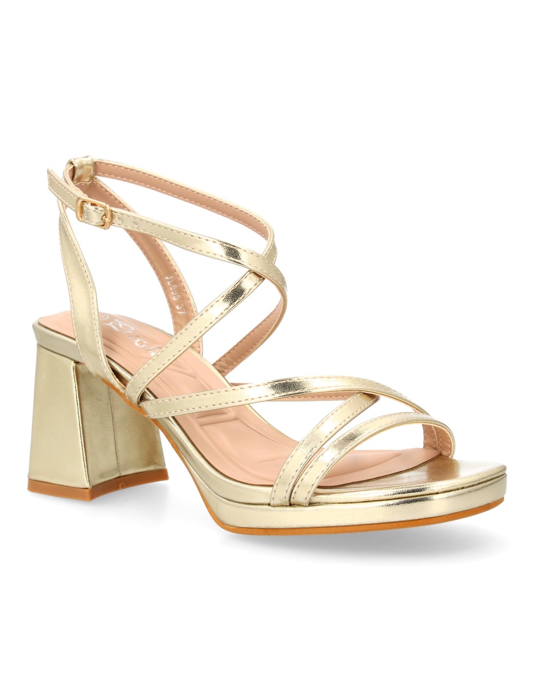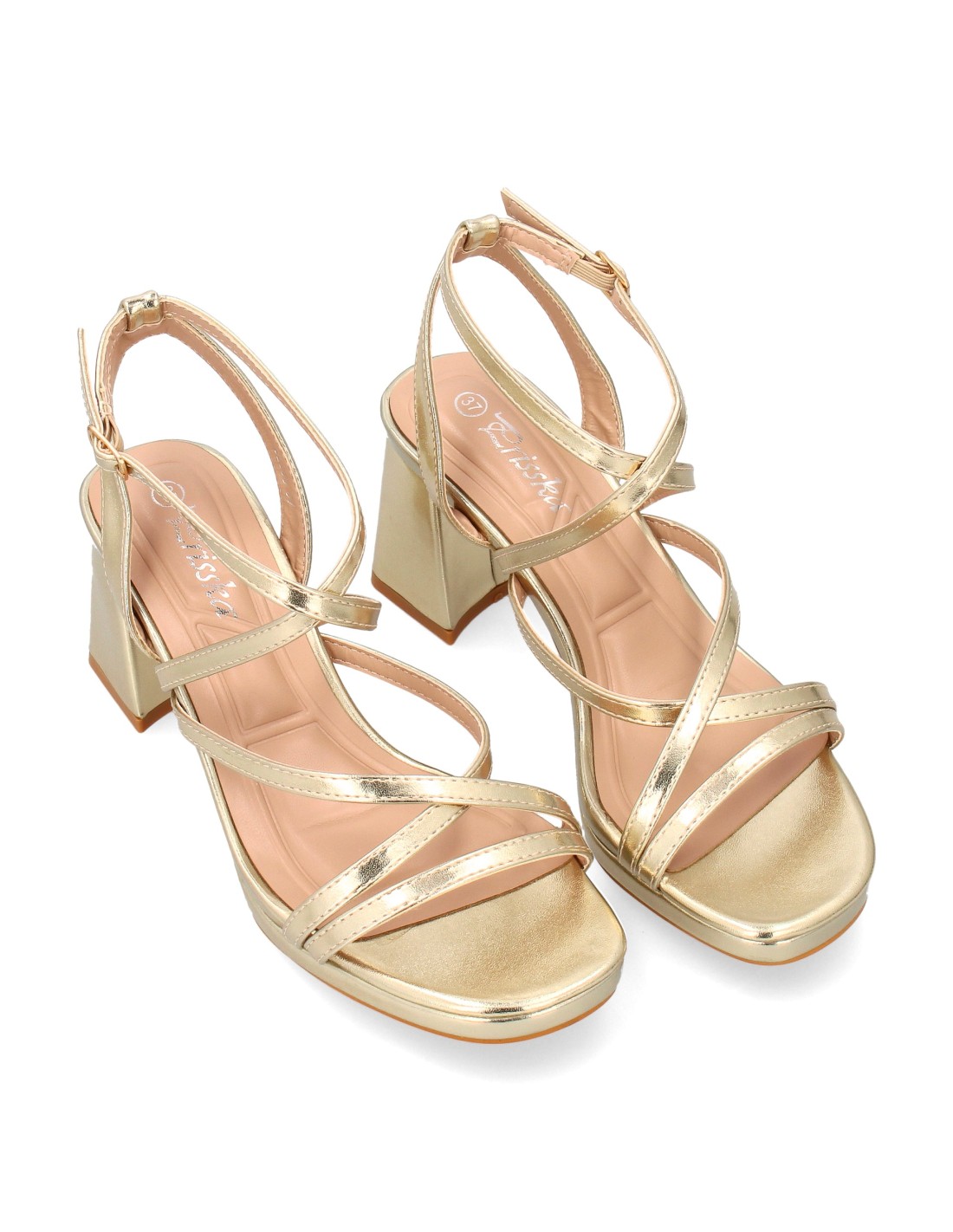 Sandalia de tacón para mujer con diseño de tiras cruzadas finas y delicadas. Tacón ancho y plataforma delantera para mayor estabilidad. ELegante para eventos con cierre de hebilla.