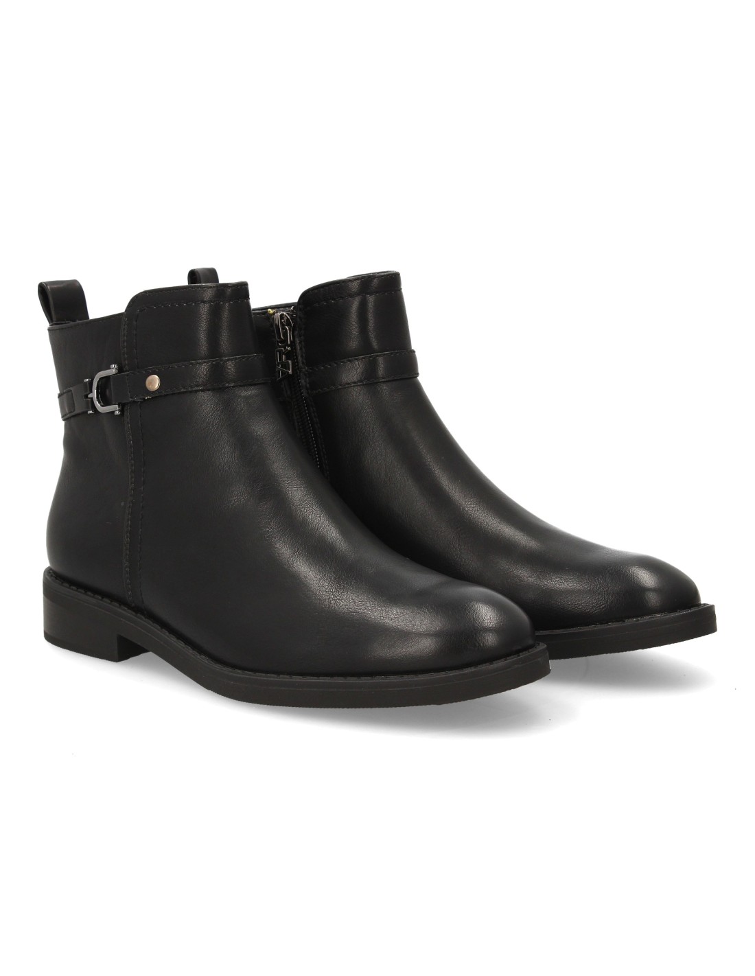 Botín plano para mujer, ideal para la temporada Otoño Invierno diseño cómodo y funcional para el día a día. Diseño con tira decorativa con hebilla metálica. Cremallera lateral y suela cómoda y flexible.