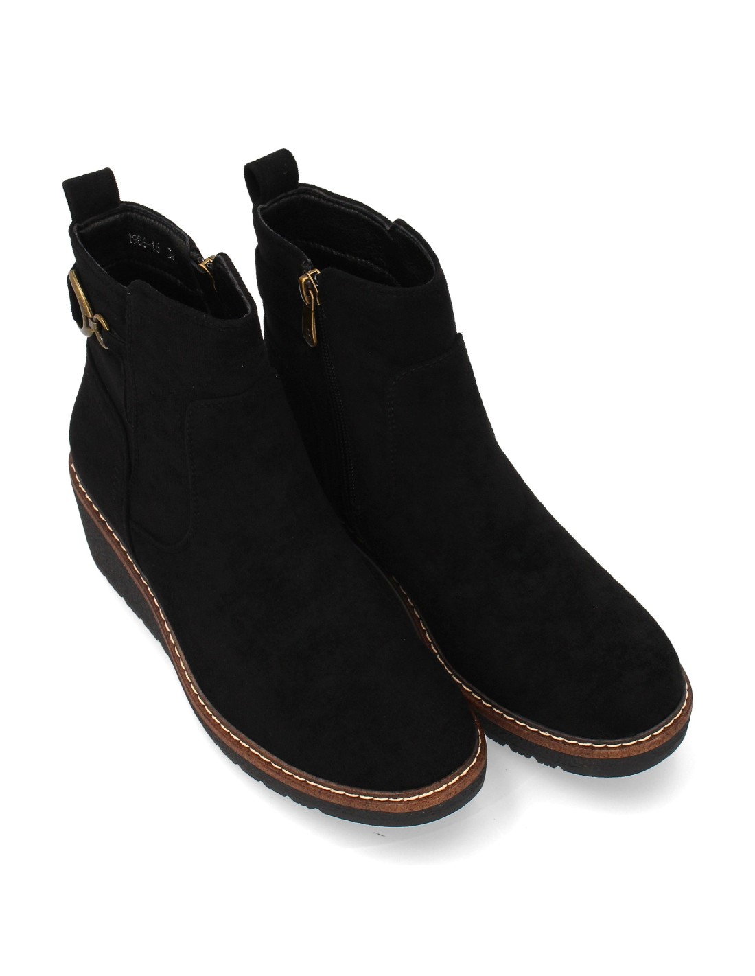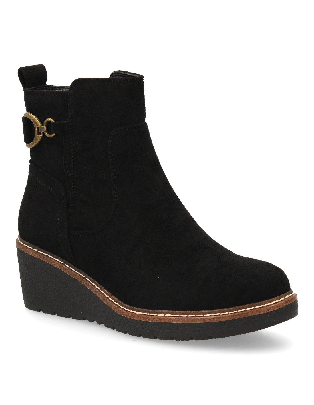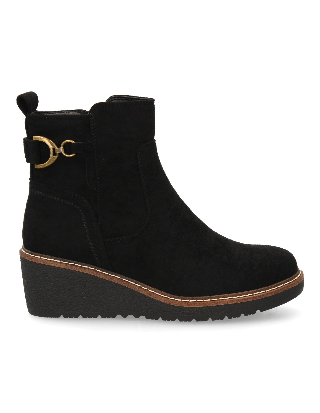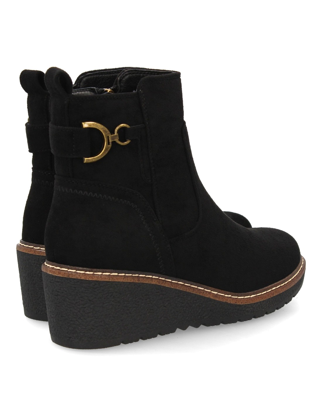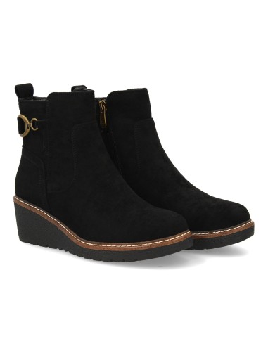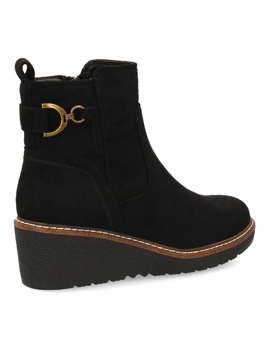 Botín para mujer con cuña cómoda para usar en el día a día. Diseño de adorno metálico lateral con estribo, cierre interior de cremallera.