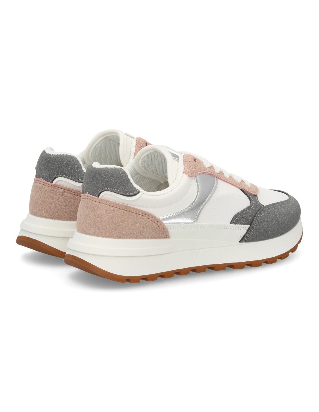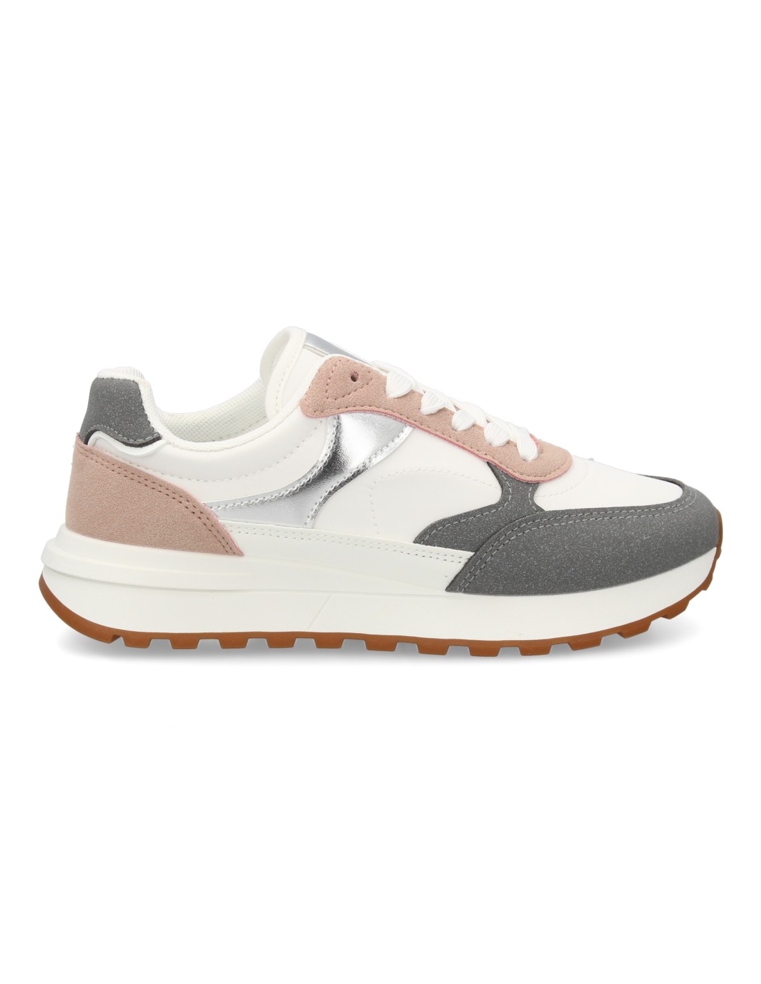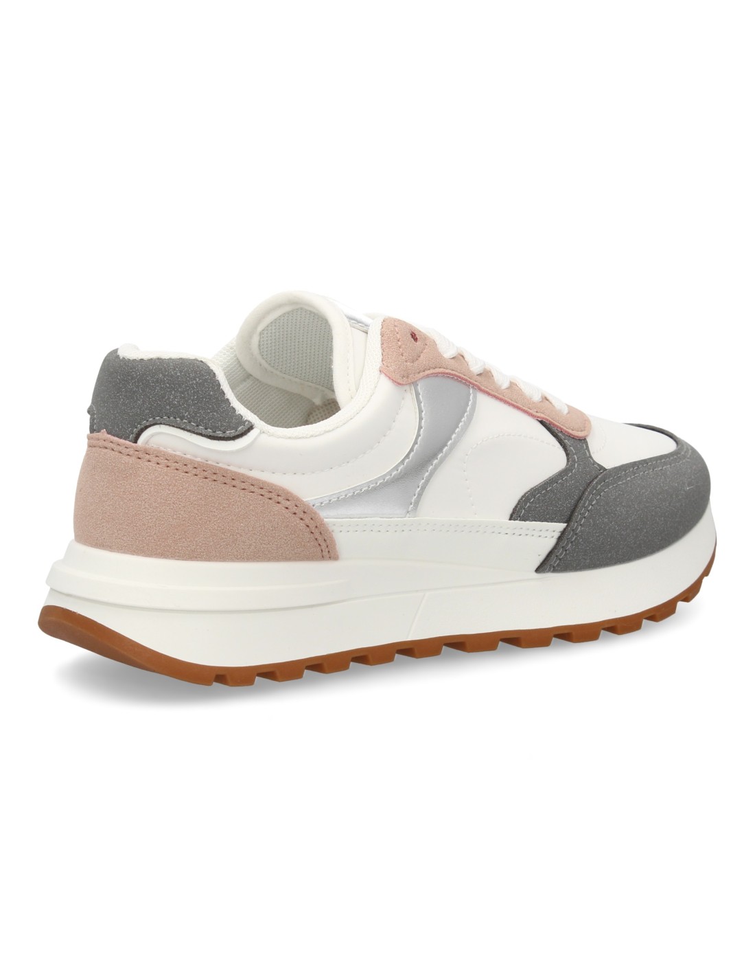 Zapatilla deportiva para mujer de estilo casual combina materiales y texturas con un diseño moderno y versátil. Incorpora paneles superpuestos en contraste con acabado brillante, suela ancha con relieve dentado.