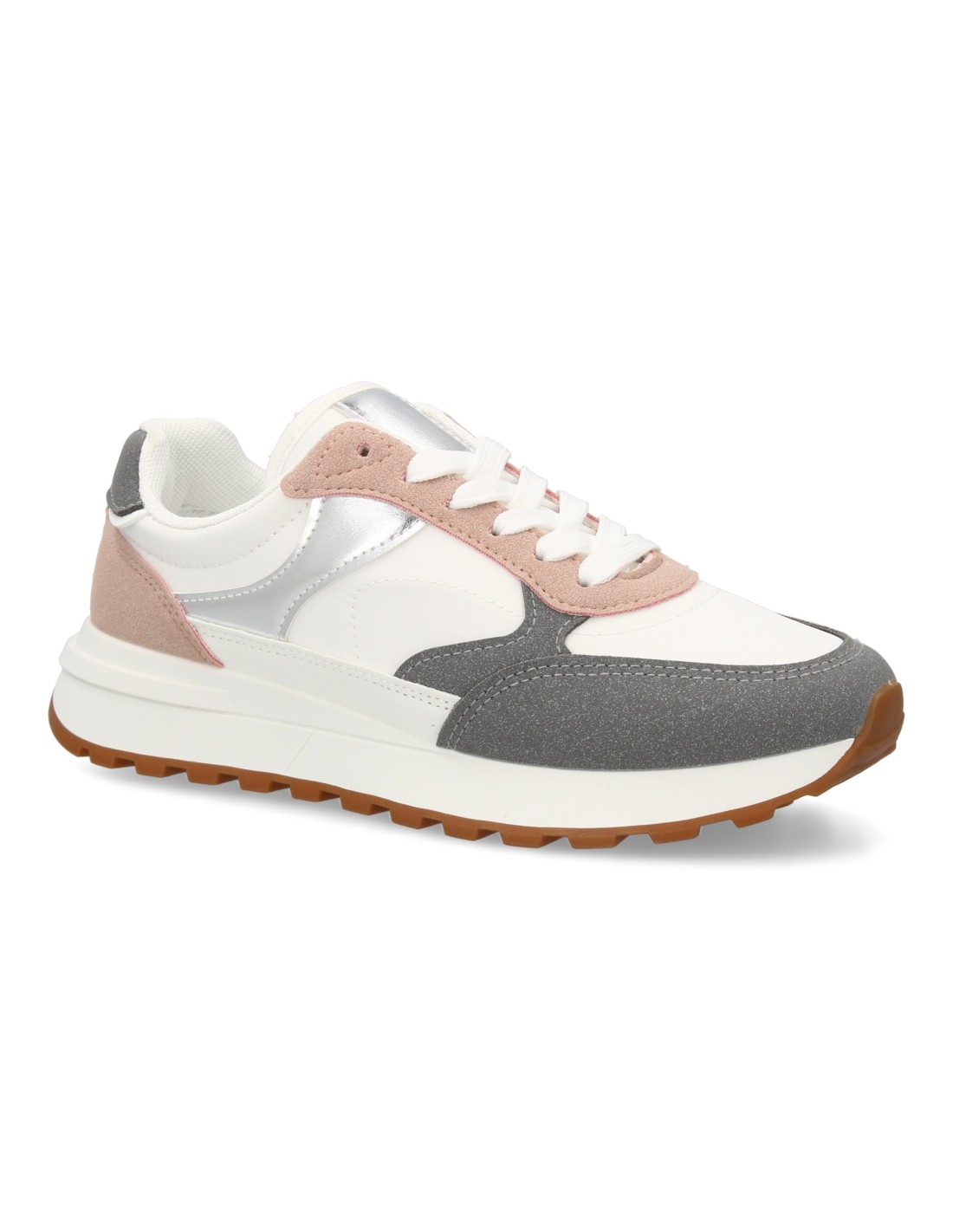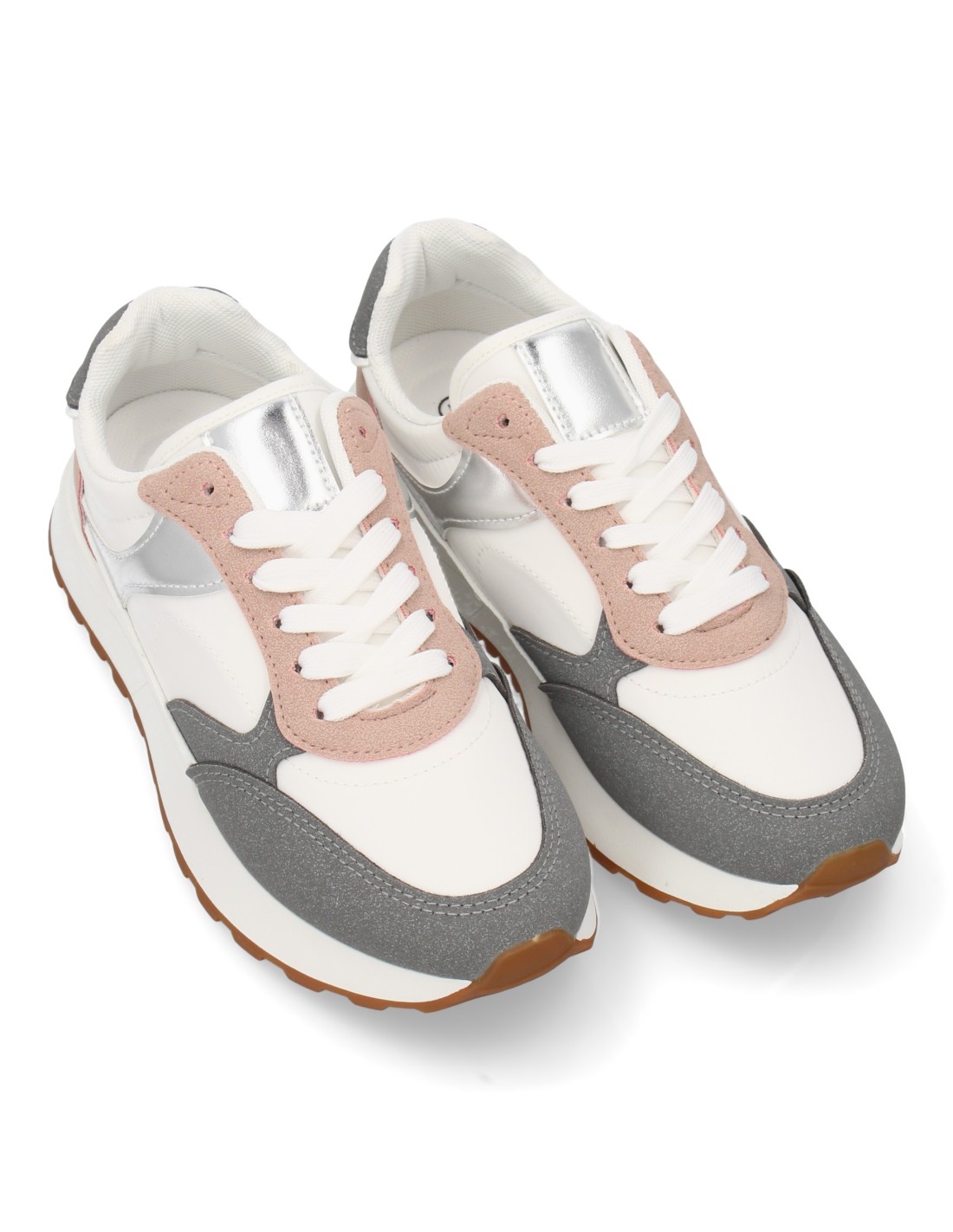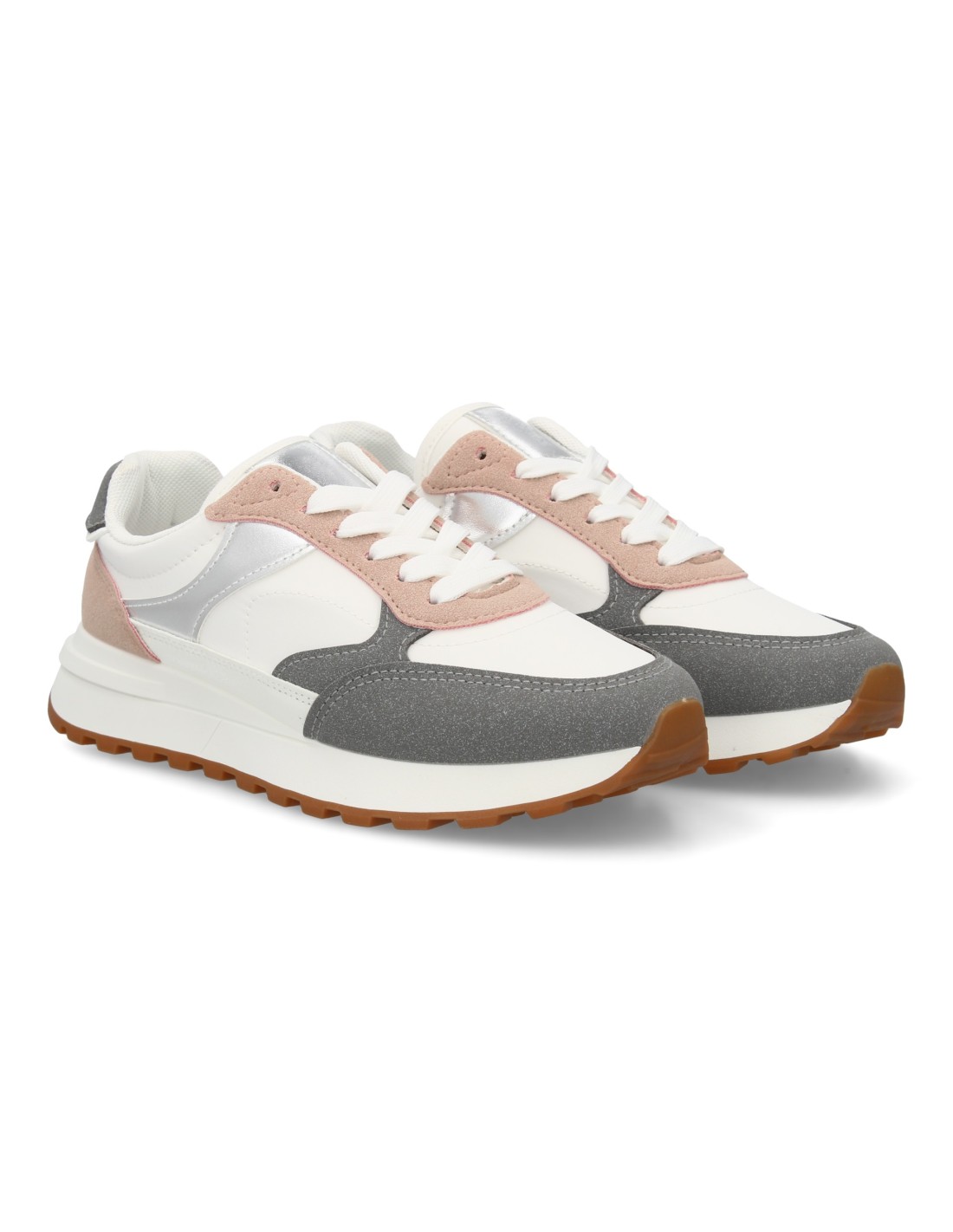 Zapatilla deportiva para mujer de estilo casual combina materiales y texturas con un diseño moderno y versátil. Incorpora paneles superpuestos en contraste con acabado brillante, suela ancha con relieve dentado.