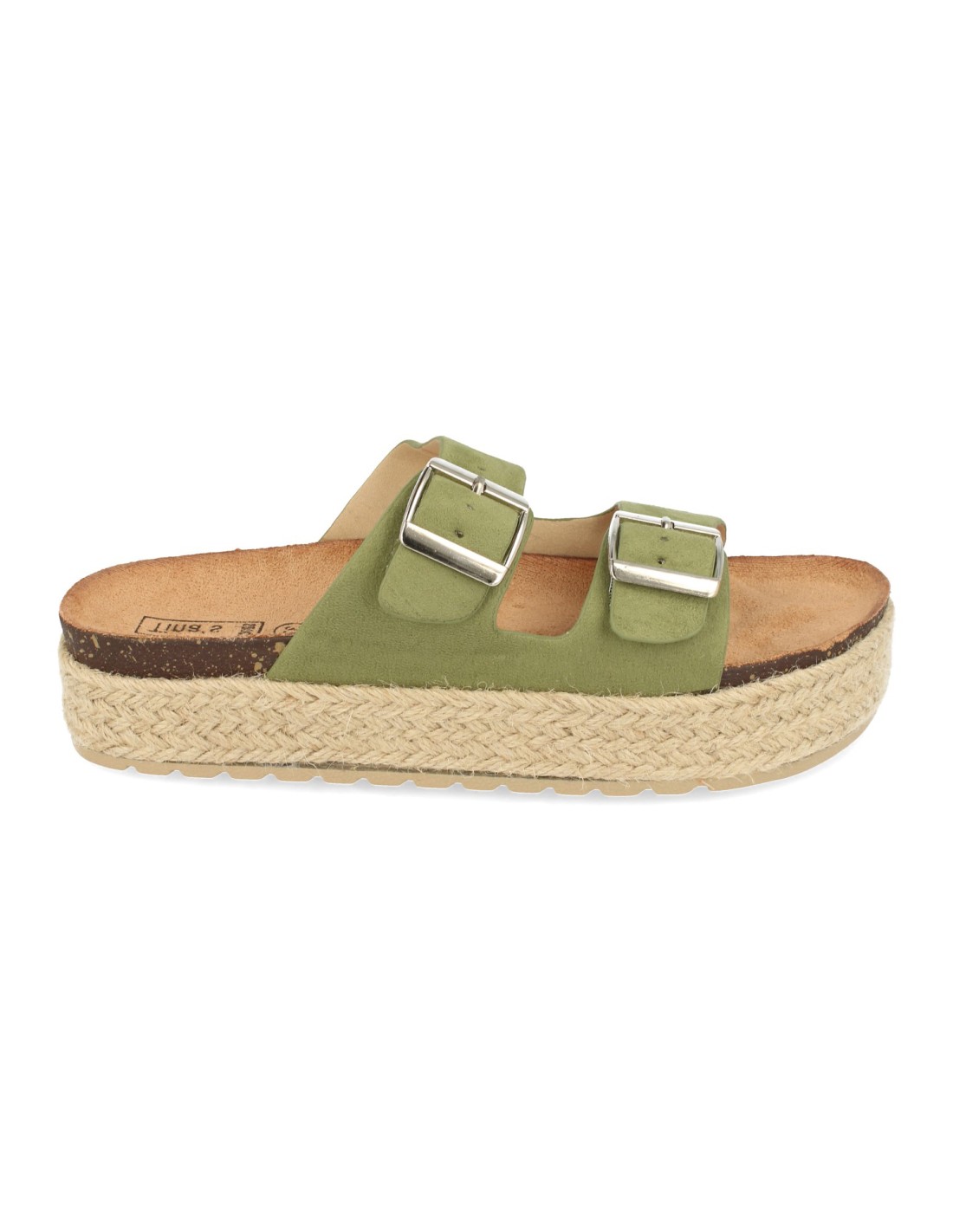 Sandalia Plana de Mujer, Forrado de Yute, con Planta Anatomica, y Hebillas en Pala, Primavera Verano 2021