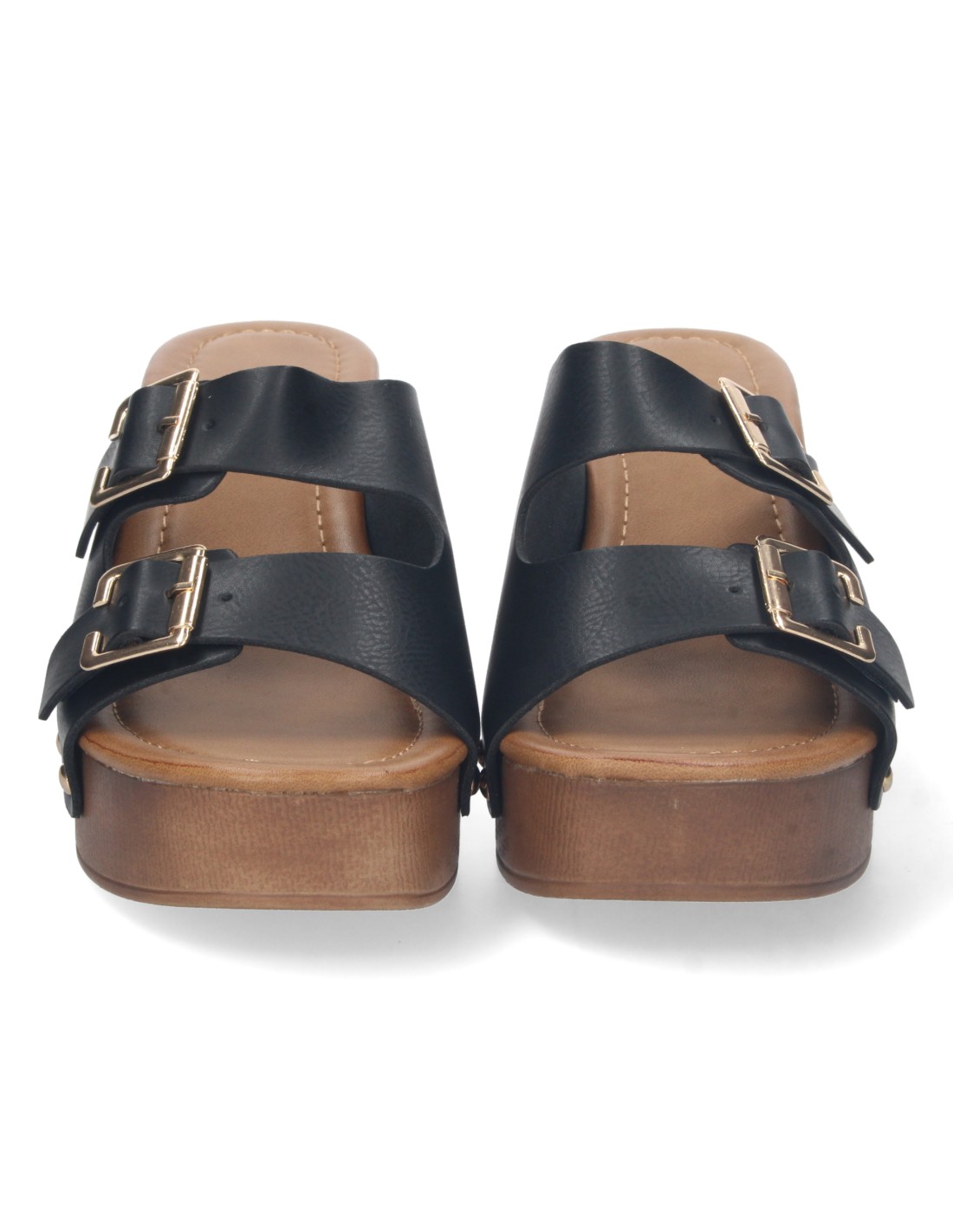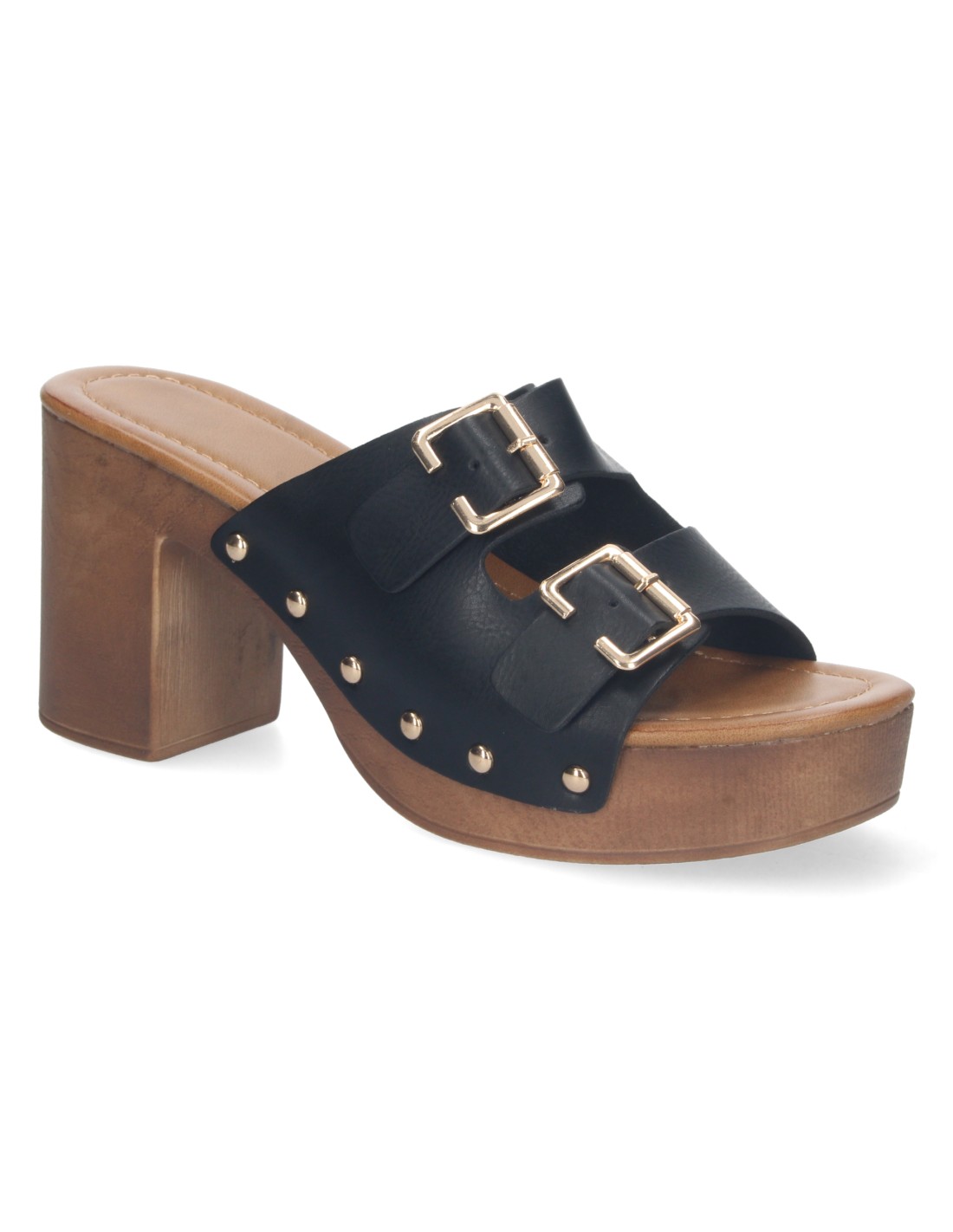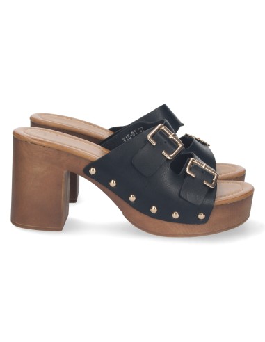 Sandalia de Tacon para Mujer, Comodo, Material de Imitacion a Madera, Palas con Hebillas, y Remaches, Talon Abierto