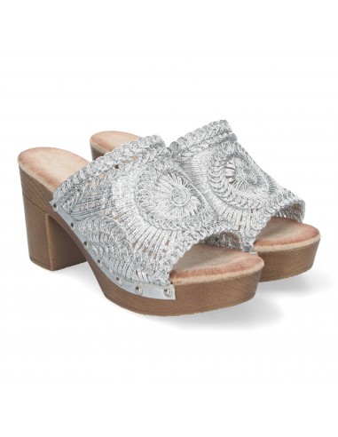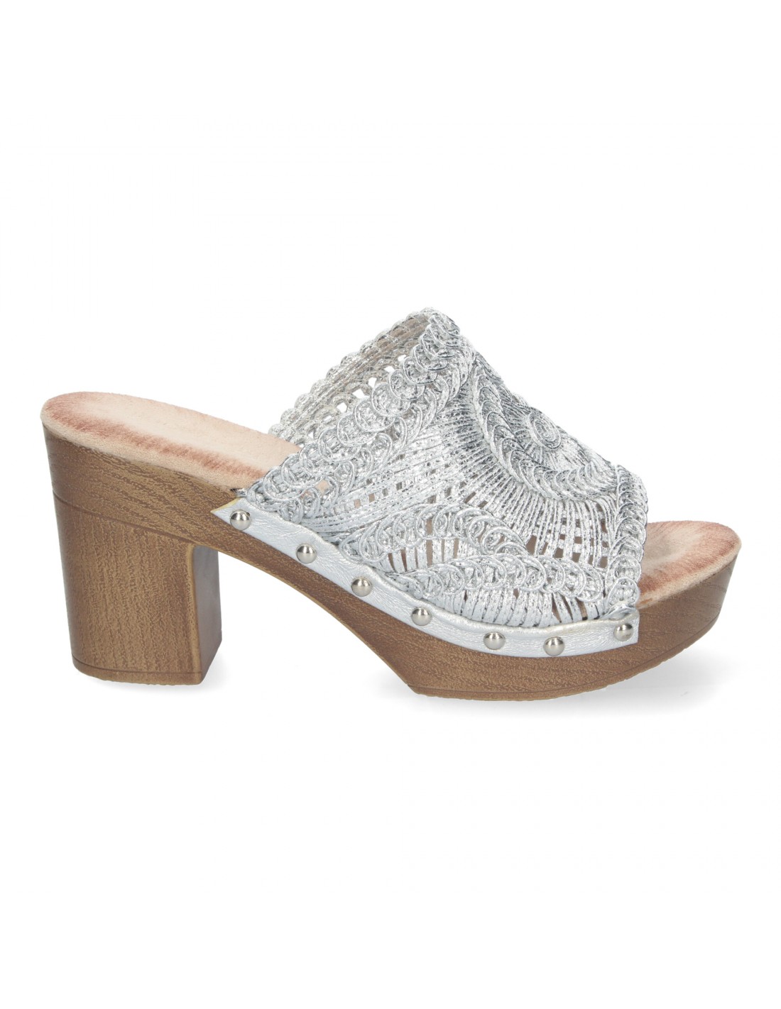 Zueco de Tacon Alto para Mujer, Comodo, Material de Imitacion a Madera, con Pala Bordada, Tachuelas, y Talon Abierto.