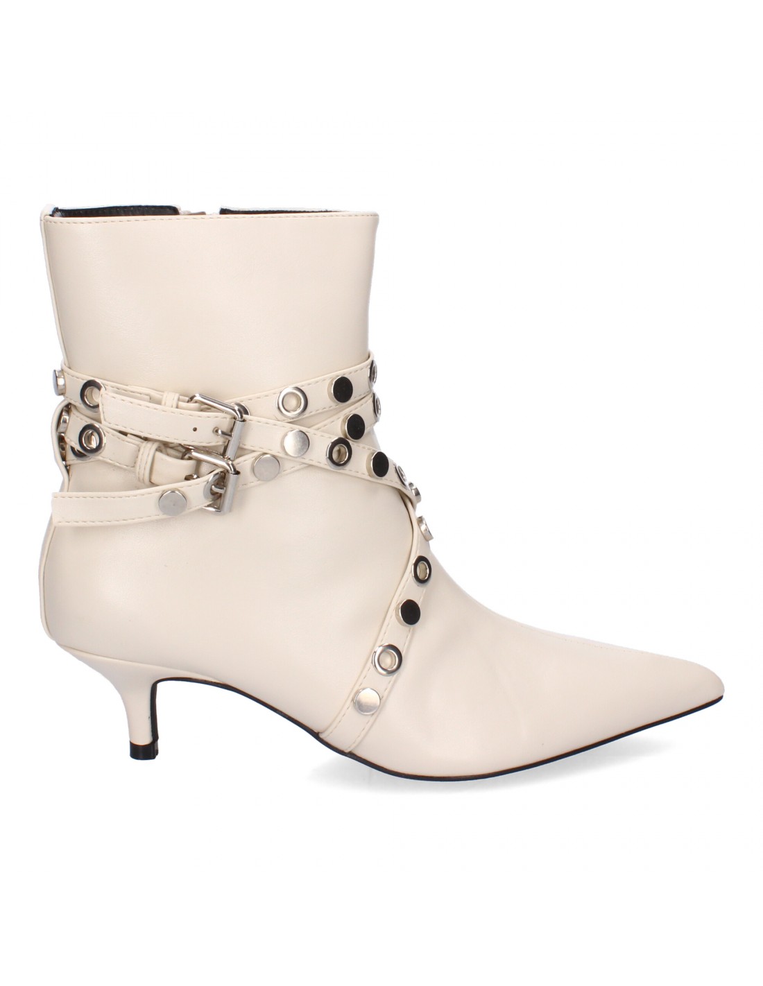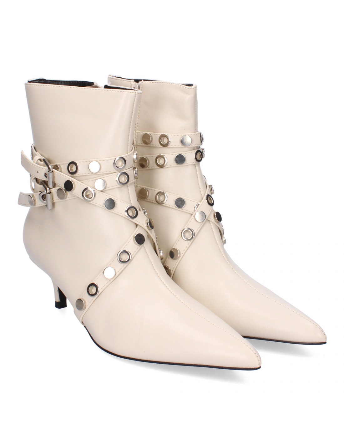 Botines de Tacón Fino para Mujer, Comodos y Elegantes, Detalle de Hebilla, Adornos Metálicos, Punta Afilada y Cierre de Cremallera.